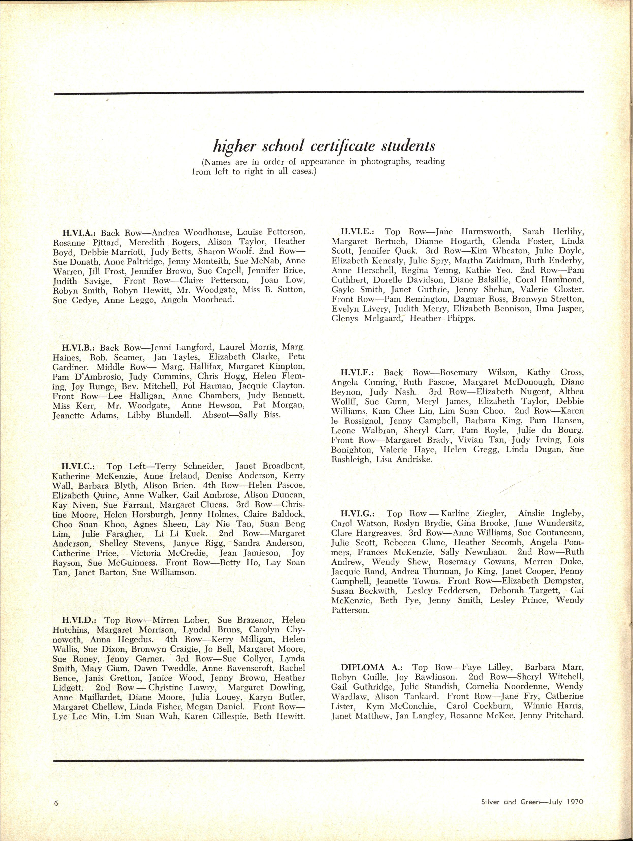 H.VI.A.: Back Row—Andrea Woodhouse, Louise Petterson, Rosanne Pittard, Meredith Rogers, Alison Taylor, Heather Boyd, Debbie Marriott, Judy Betts, Sharon Woolf 2nd Row— Sue Donath, Anne Paltridge, Jenny Monteith, Sue McNab, Anne Warren, Jill Frost, Jennifer Brown, Sue Capell, Jennifer Brice, Judith Savige, Front Row—Claire Petterson, Joan Low, Robyn Smith, Robyn Hewitt, Mr Woodgate, Miss B Sutton, Sue Gedye, Anne Leggo, Angela Moorhead