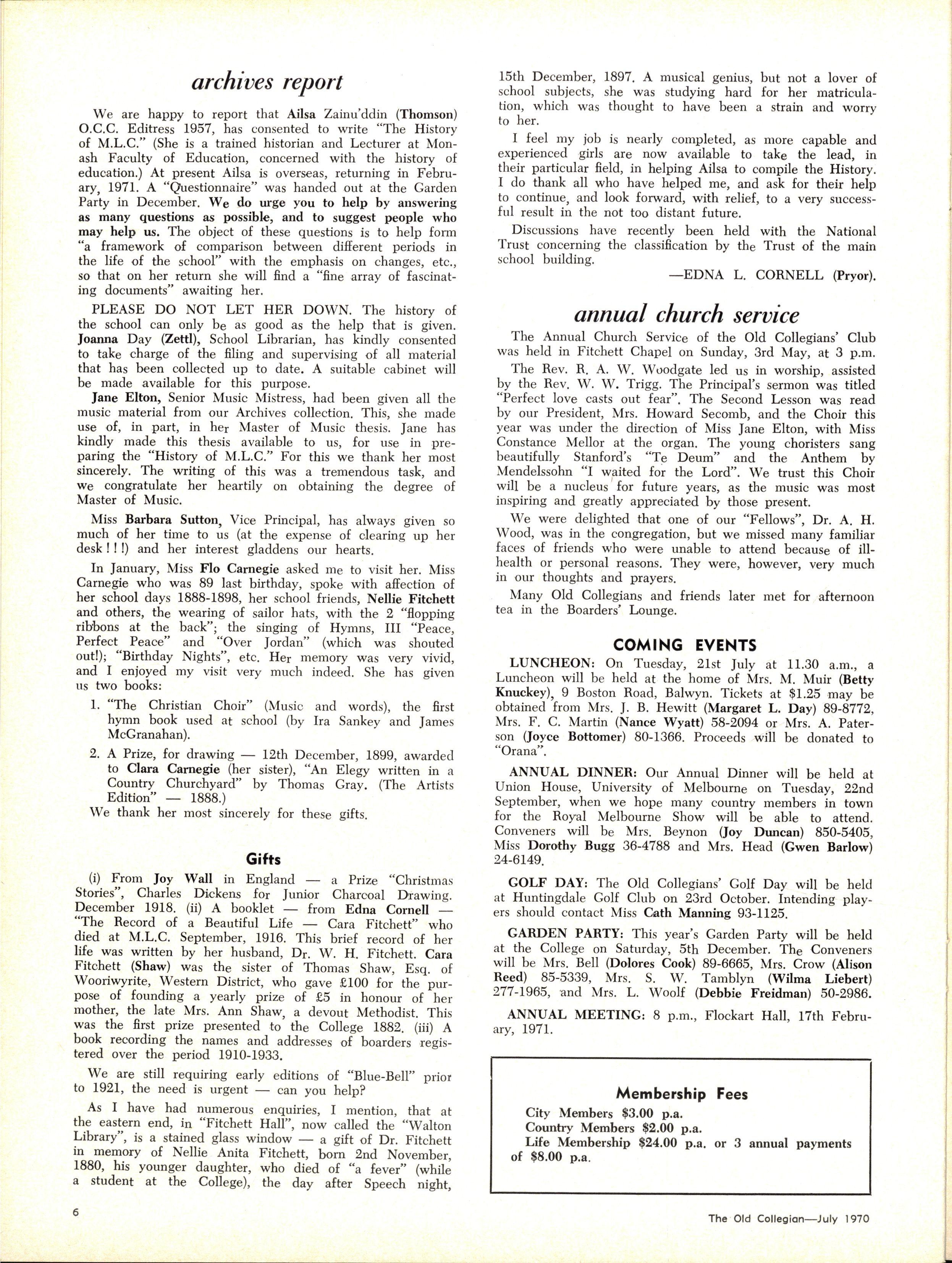 Miss Elton reports on the continued interest of young Old Collegians in choral music as a number of 1968 and 1969 girls formed a choir which sang at the Old Collegians' Church Service in May