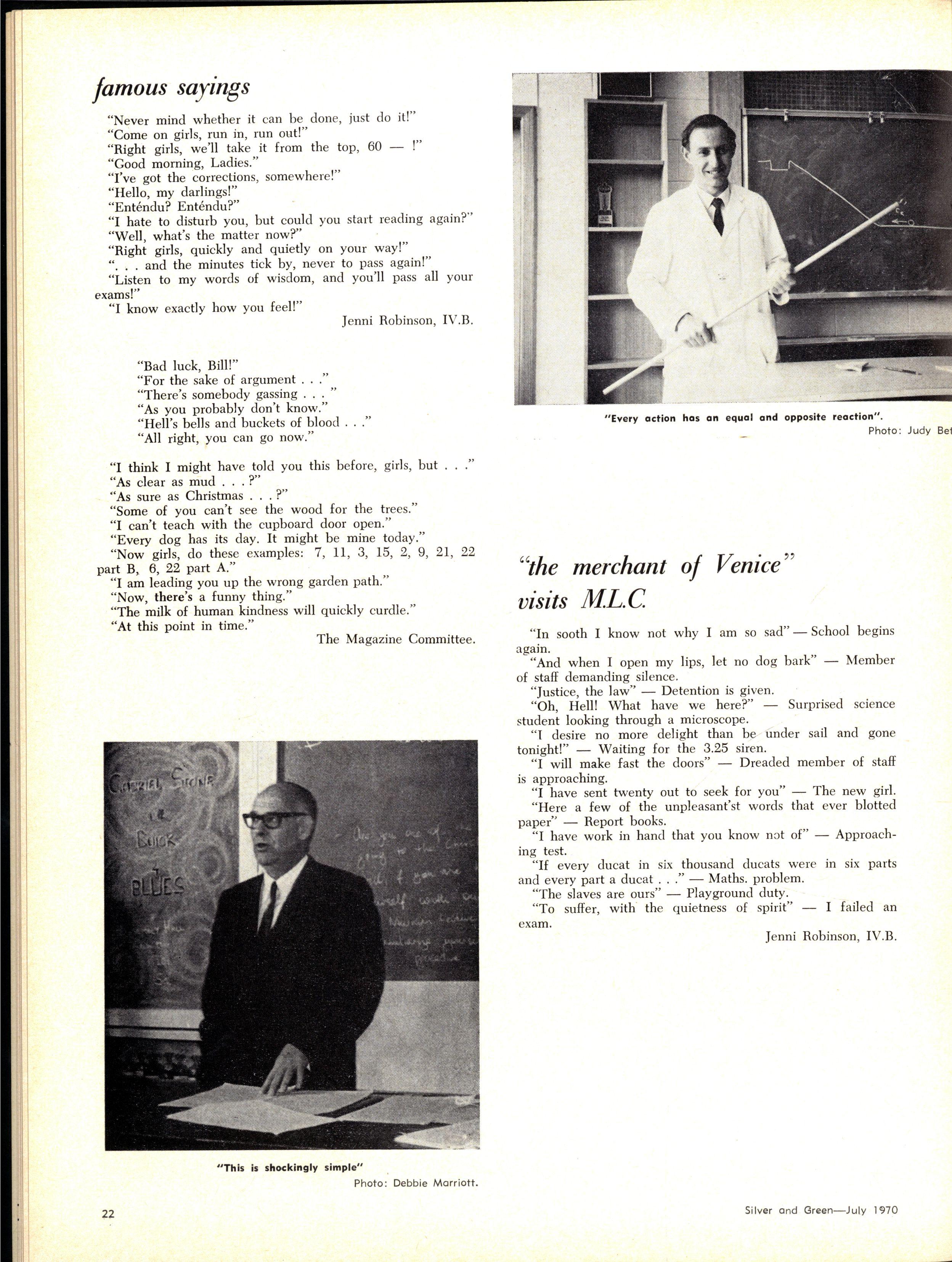 There will be many interesting events during the drama year The first is the presentation by the Fourth Form drama group of scenes from "The Merchant of Venice", "Toad of Toad Hall" and "St Joan", under the direction of Mrs Wilkinson
