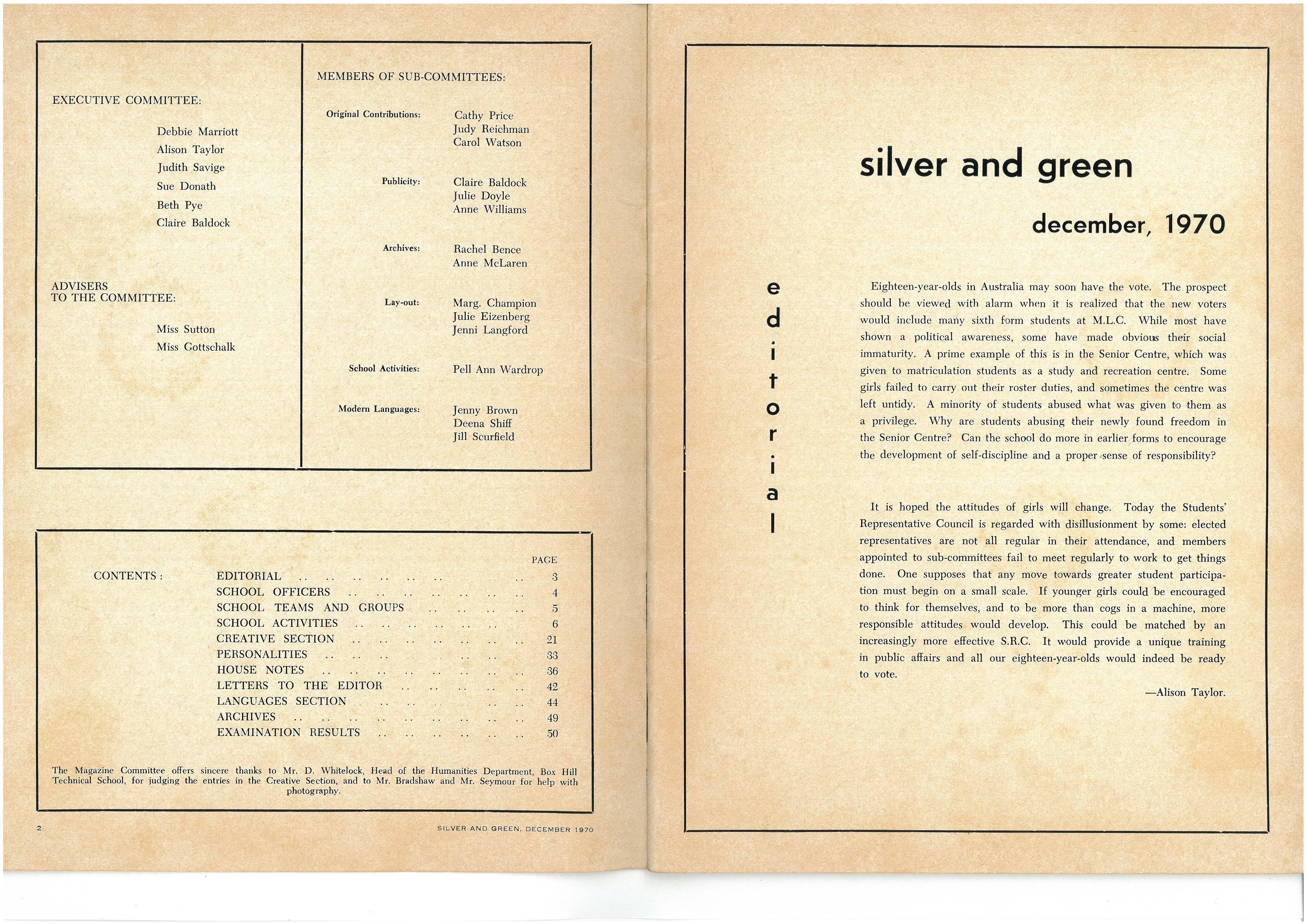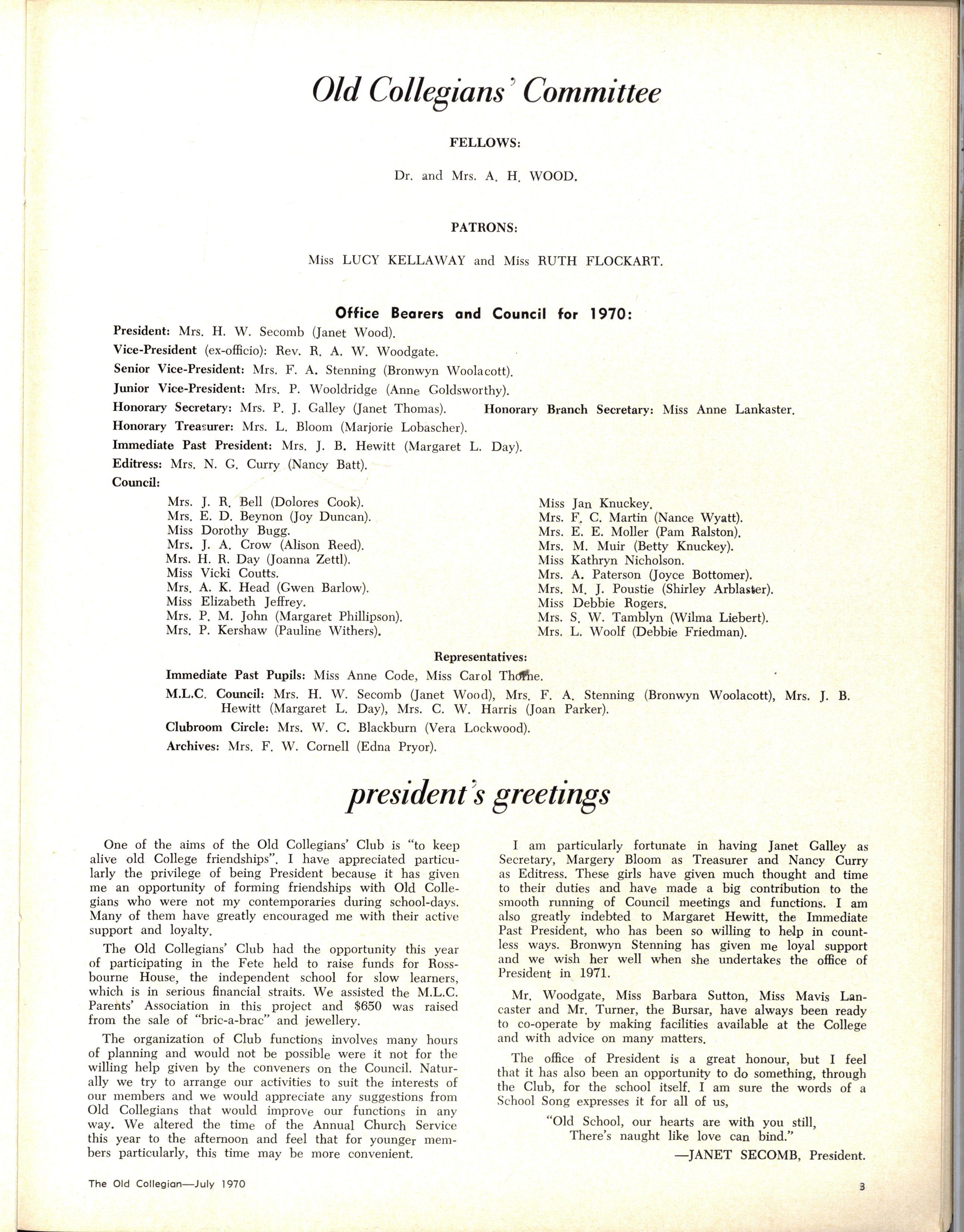 S.C.M. Executive: Adviser, The Rev W Trigg; Joint Secretaries, Rachel Bence and Libby Blundell Committee—Heather Boyd, Bronwyn Ambrose, Jenny Dei-went, Kate Clements, Jocelyn Trigg Junior—President, Marion Earl; Secretary, Dianne Ellis; Treasurer, Merrin Greeiftiffl