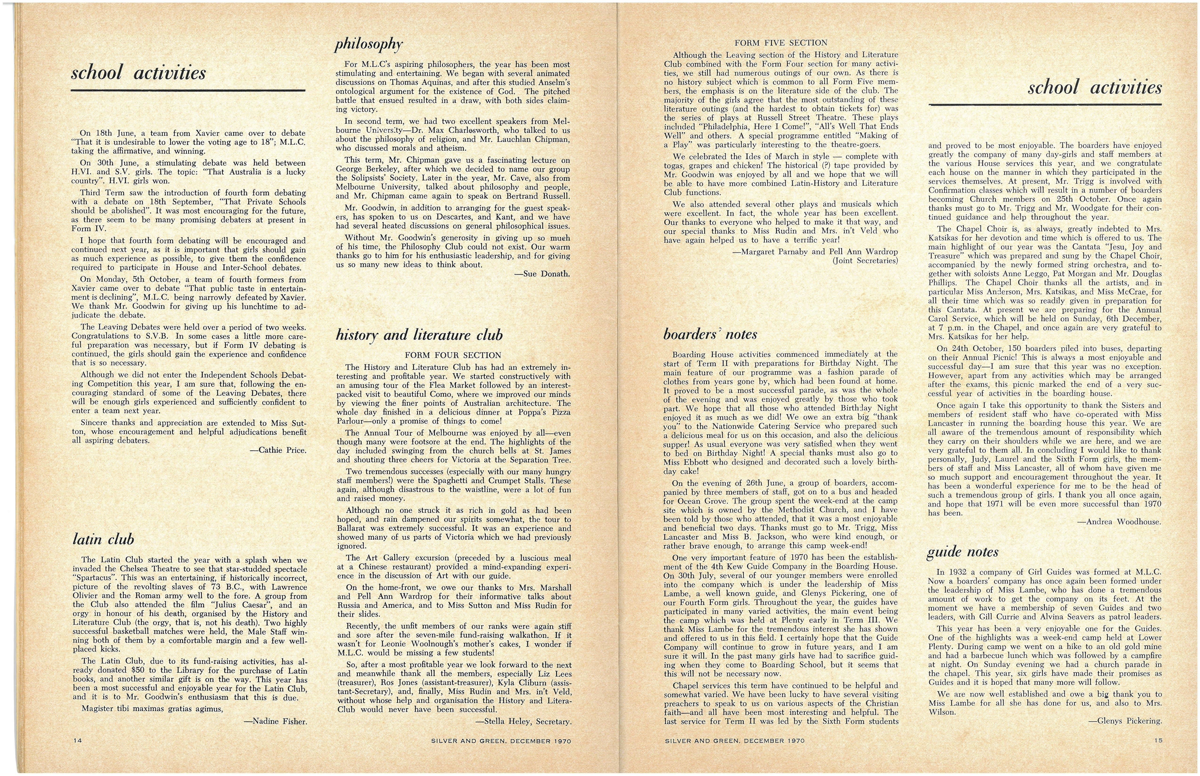 History and Literature Club: S.V Secretary (Joint), Margaret Parnaby, Pell Ann Wardrop; Treasurer (Joint), Leonie Woolnough, Chris Brown Form IV—Secretary, Stella Heley, Assistant Secretary, Kyla Cliburn; Treasurer, Elizabeth Lees; Assistant Treasurer, Roslyn Jones; Publicity—Angela Kominos, Mary Hyatt, Anne Cook, Ann Niven