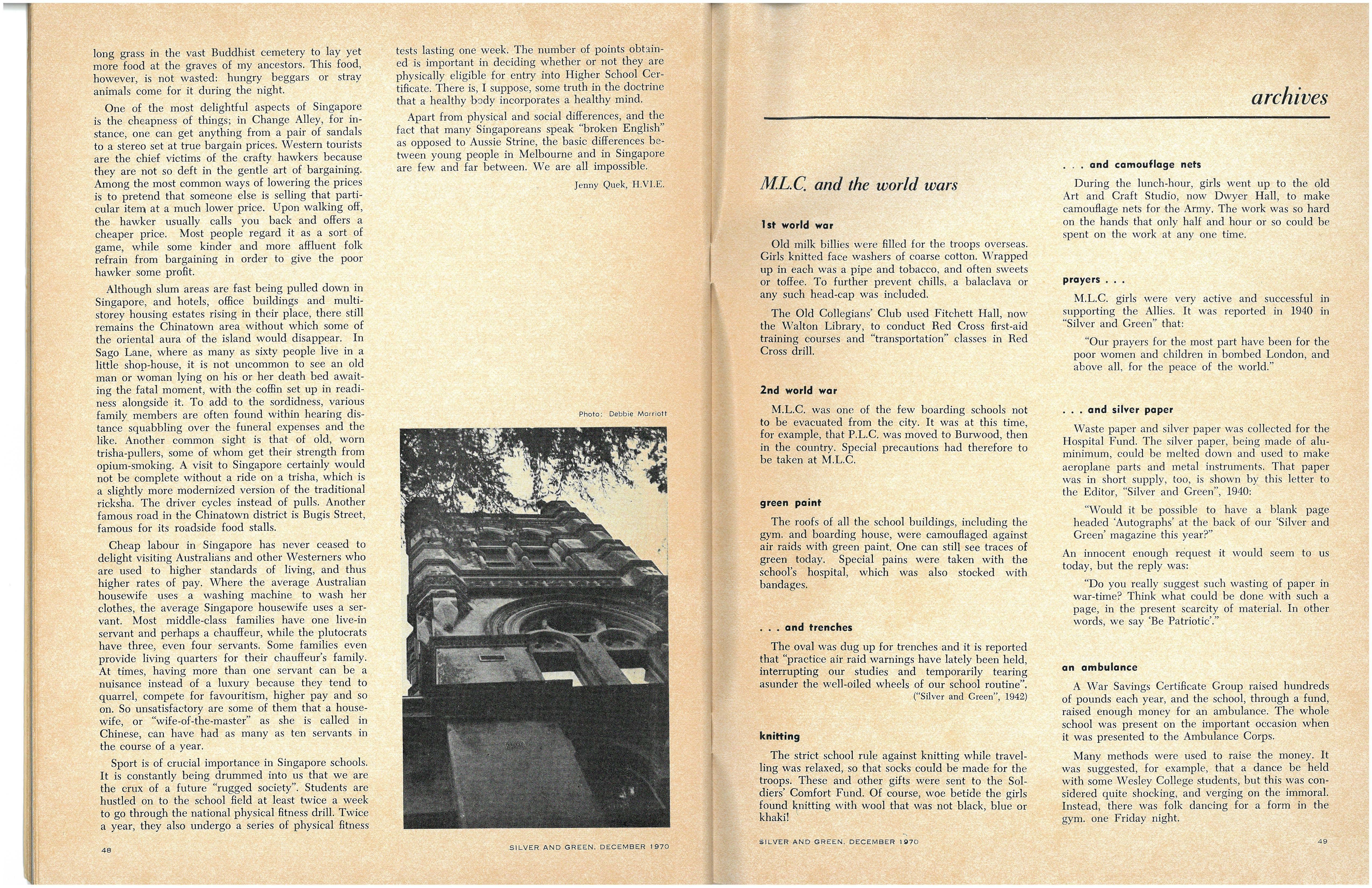 Many methods were used to raise the money. It was suggested , for example, that a dance be held with some Wesley College students, but this was considered quite shocking, and verging on the immoral. Instead, there was folk dancing for a form in the gym. one Friday night.