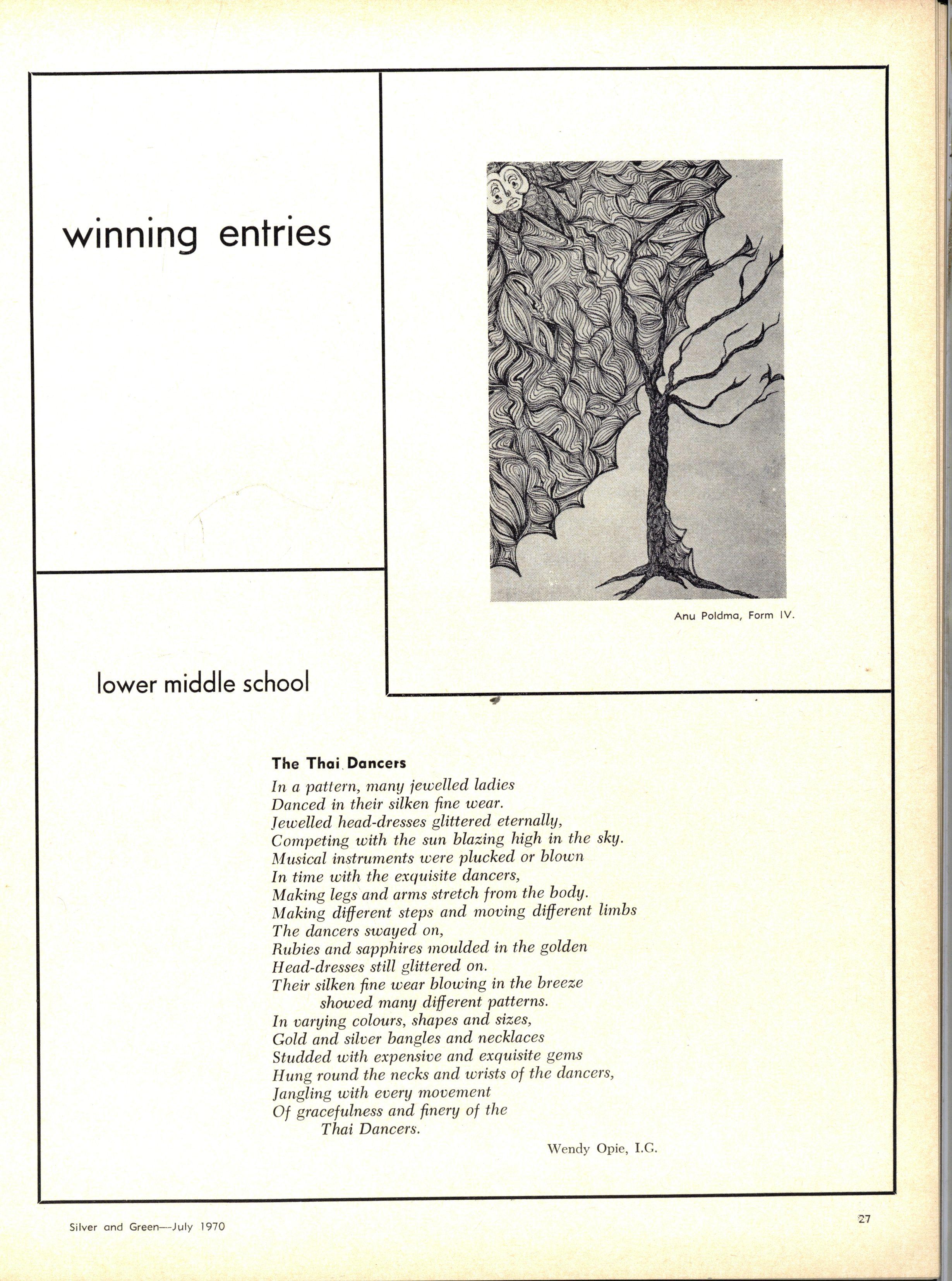 Form Three - First Prize, Lynda] Roper; Second Prize, Carolyn Mase! ; Third Prize (shared), Kathryn James.