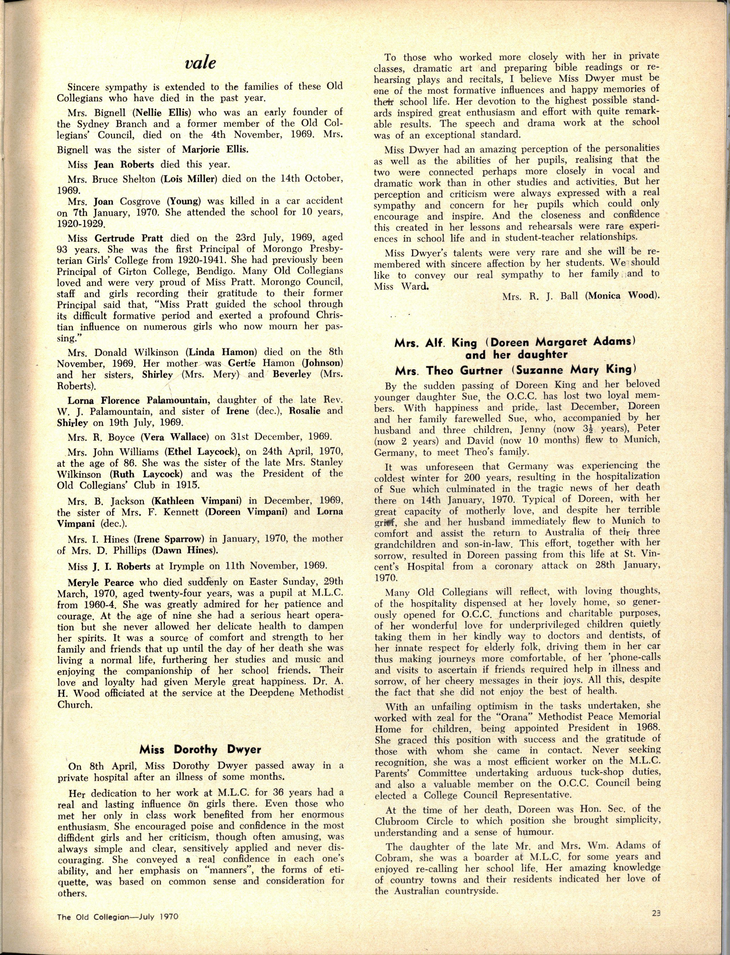 It was very sad that Miss Dwyer was unable to judge the scholarship examinations, as she was extremely ill It was a great loss to many people when they heard of her death, as she had created a tradition at M.L.C