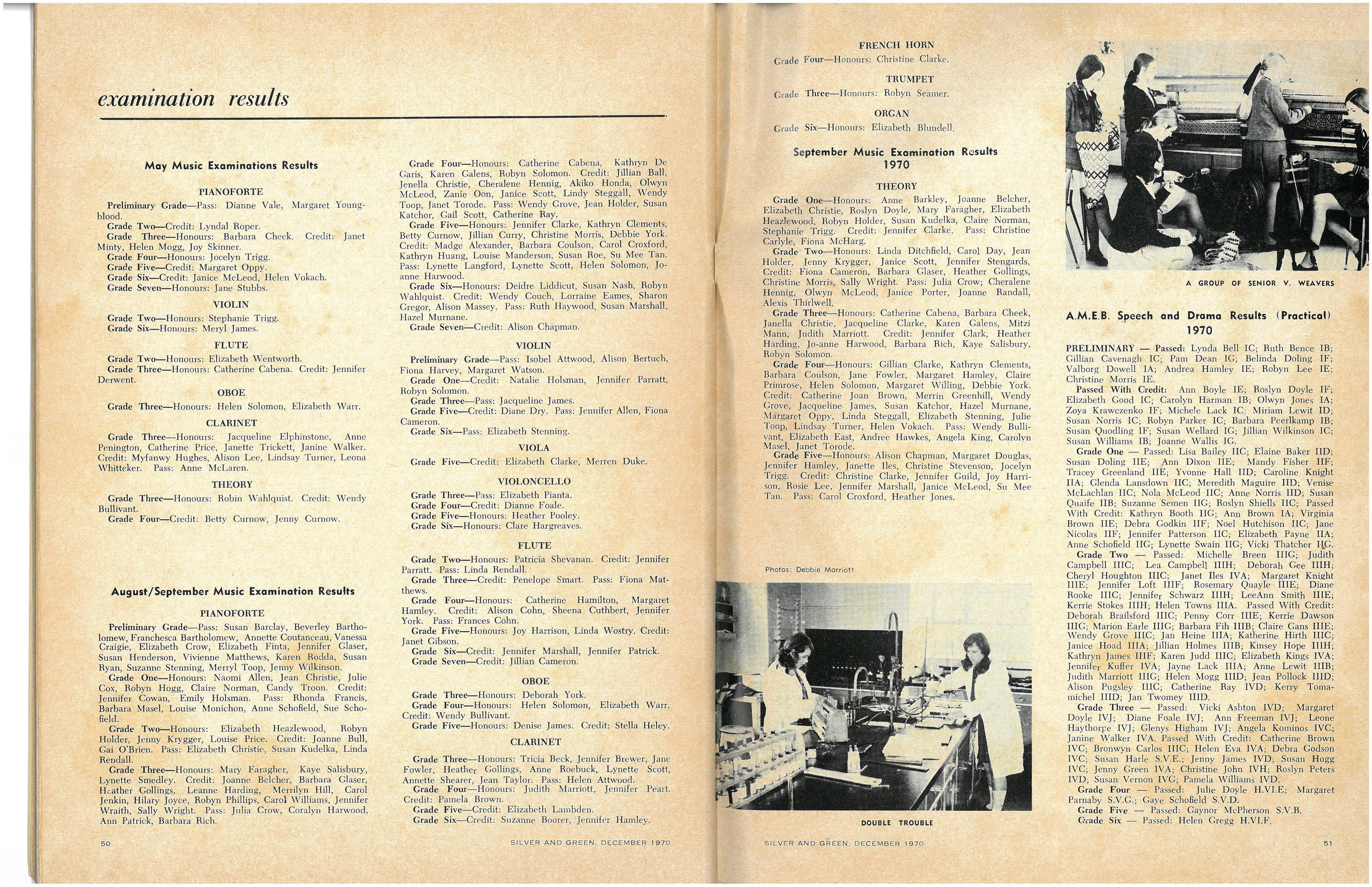 Grade Three - Passed : Vicki Ashton IVD; Margaret Doyl e IVJ; Diane Foale IVJ; Ann Freeman IVJ; Leone Ha~thorpe IVJ; Glenys Higham IVJ; Angela Kominos IVC; Janme Walker IVA Passed With Credit : Catherine Brown IVC; Bronwyn Carlos IIIC; Hel e n Eva IV A; Debra Godson IVC; Susan Harle S.V.E.; Jenny James IVD; Susan Hogg IVC; Jenny Green IVA; Christine John IVH; Roslyn Peters IVD; Susan Vernon IVG; Pamela Williams IVD.