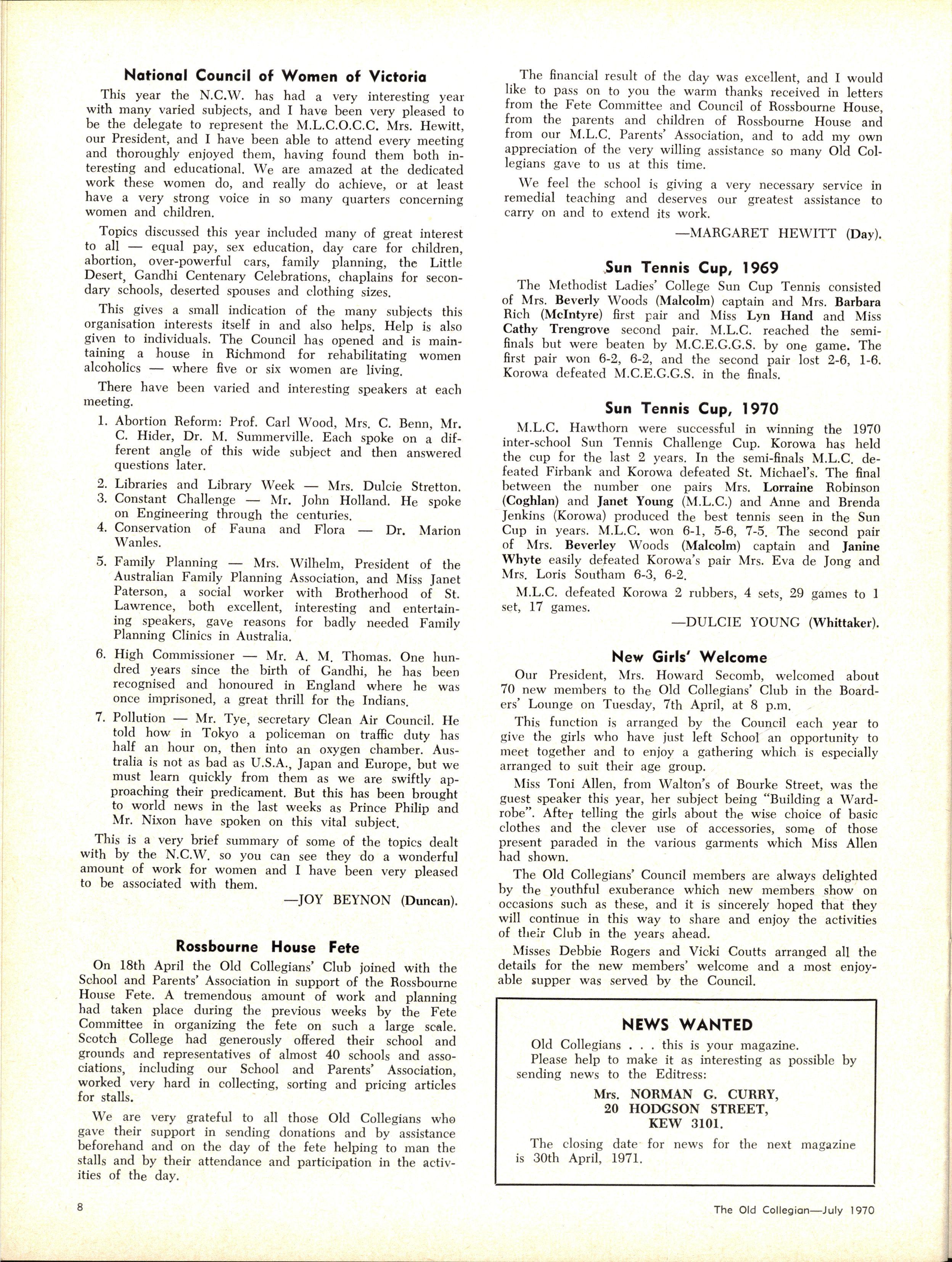 The School has been very pleased to welcome these new members of Staff this year:— Mrs J Acton, B.Ed., Music (Junior School), (returning); Mrs S Chapman, Art and Craft; Mrs M Cullum, B.A (Old Collegian), English; Miss J Cumbrae-Stewart, Physical Education; Miss A Davies (Old Collegian), Art and Craft; Miss J J Davies, B.A., Dip.Ed., English; Miss B Davis, B.A., Dip.Ed., German and English; Miss T Denison, B.A (Hons), Russian; Mrs M Hi'ilis, French; Mrs K Hopper, B.Com (Old Collegian), Economics, Business subjects; Miss L James, Art and Craft; Mrs M Martin, General Science; Miss C Nordman, B.A., English, French; Mrs J Porter, B.Com., Dip.Ed., Geography; Mr L Stevens, B.Met.E., B.Ed., Mathematics; Miss M Swadesir (Old Collegian), General Science, Mathematics; Miss A Wolf, B.A., Mathematics; Miss A Wilks (Old Collegian), (Laboratory Assistant); Miss R Lewis (Old Collegian), (Student teacher, Business School); Miss G Shellcot (Old Collegian), Teaching Aide, Home Economics