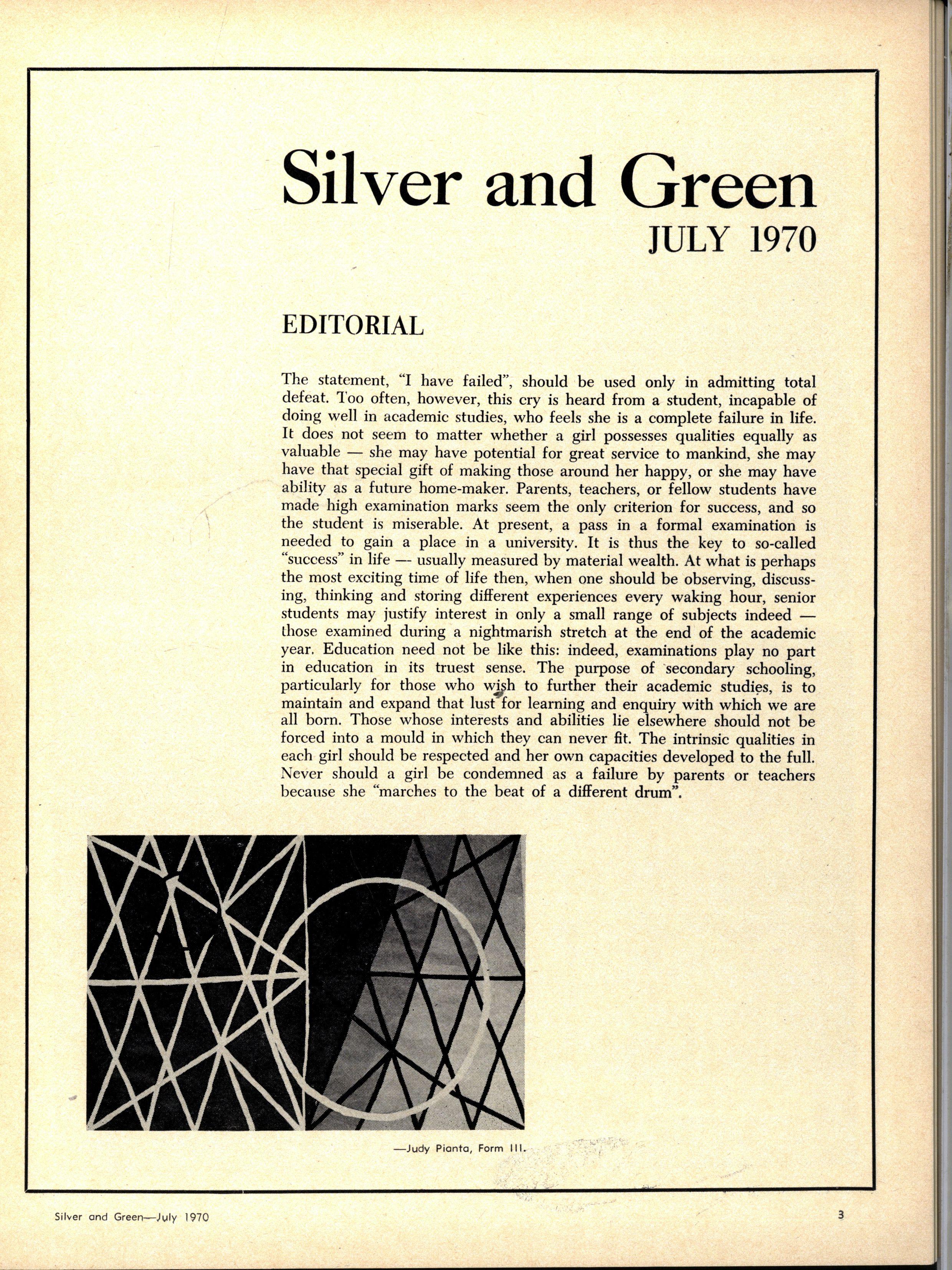 The statement, "I have failed", should be used only in admitting total defeat. Too often, however, this cry is heard from a student, incapable of doing well in academic studies, who feels she is a complete failure in life. It does not seem to matter whether a girl possesses qualities equally as valuable — she may have potential for great service to mankind, she may have that special gift of making those around her happy, or she may have ability as a future home-maker. Parents, teachers, or fellow students have made high examination marks seem the only criterion for success, and so the student is miserable. At present, a pass in a formal examination is needed to gain a place in a university. It is thus the key to so-called "success" in life — usually measured by material wealth. At what is perhaps the most exciting time of life then, when one should be observing, discussing, thinking and storing different experiences every waking hour, senior students may justify interest in only a small range of subjects indeed — lliose examined during a nightmarish stretch at the end of the academic year. Education need not be like this: indeed, examinations play no part in education in its truest sense. The purpose of secondary schooling, particularly for those who wiph to further their academic studies, is to maintain and expand that lust for learning and enquiry with which we are all born. Those whose interests and abilities lie elsewhere should not be forced into a mould in which they can never fit. The intrinsic qualities in each girl should be respected and her own capacities developed to the full. Never should a girl be condemned as a failure by parents or teachers because she "marches to the beat of a different drum".