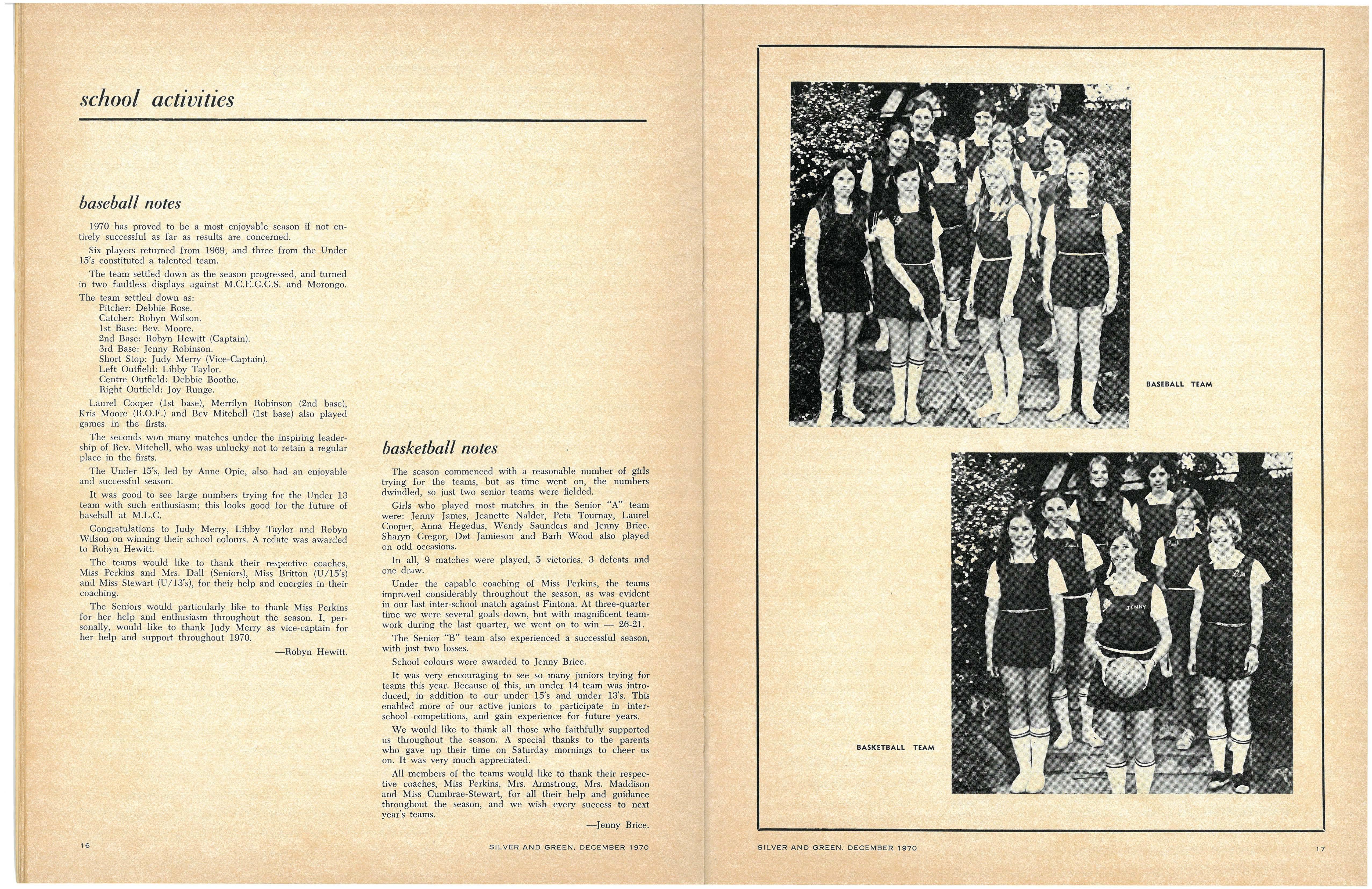 House Baseball Captains: Senior—Beverley Mitchell (Berry), Margaret Champion (Cato), Debbie Rose (Fitchett), Joy Runge (Krome), Robyn Wilson (Nevile), Heather Kelly (Tiddeman) Junior—Catherine Welsford (Berry), Nerida Jungwirth (Cato), Julie Graham (Fitchett), Penny Shaw (Krome), Sue Bull (Nevile), Gaynor Brough (Tiddeman)