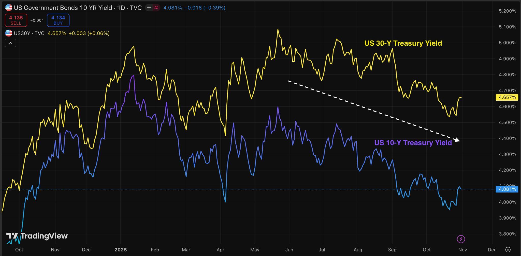 殖利率的回落反映了多重預期轉變,包括降息前景、經濟成長趨緩,以及避險需求上升。