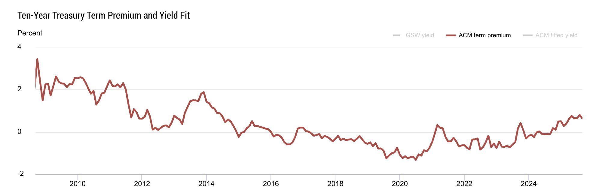 長期公債的「期限溢酬」(term premium)——即投資人為承擔長期持有風險而要求的額 外報酬 近期由負轉正。這是五年來首次出現正值,標誌著投資人情緒的明顯轉變:市 場不再僅關注衰退風險,而是開始要求對財政赤字與通膨不確定性的風險補償。