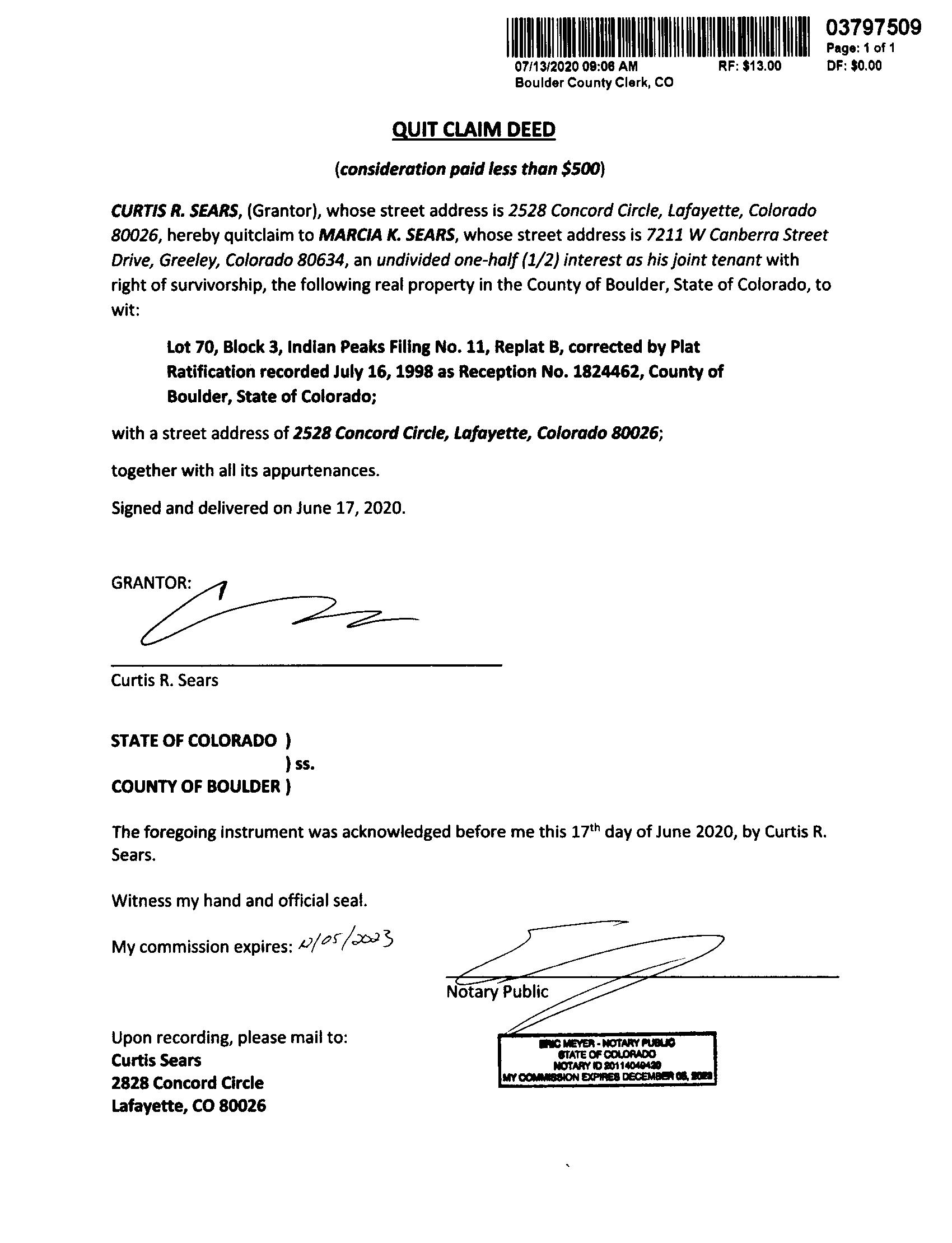 Deed Type : Quit Claim Deed
