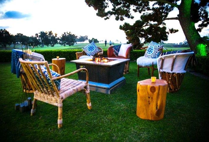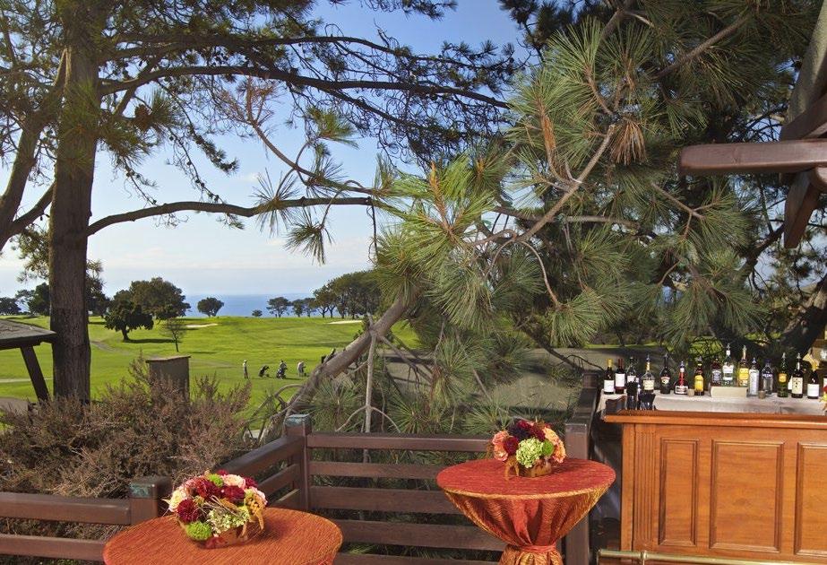 The Charles Fries room features panoramic views of the famed Torrey Pines Golf Course from both the inside space and wraparound deck. Outside, a stone fireplace and comfortable patio furniture complete this well-appointed venue.