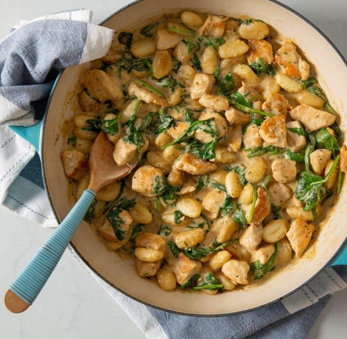 Add broth; bring to a boil and cook until reduced by half. Add chicken; simmer 5 minutes. Add cheese, stirring until blended. Gradually add spinach until wilted. Stir in gnocchi.