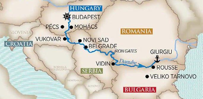 Budapest, Mohacs, Pecs, Vukovar, Belgrade, Novi Sad, Iron Gates, Vidin, Rousse, Veliko Tarnovo, Bucharest, Giurgiu