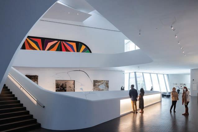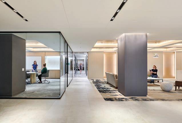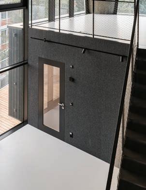modules, each composed of four square and rectangular three-dimensional shapes from tapered Claro acoustical panels of different thicknesses. Special hollow core construction lightens the overall load on the custom steel support system.