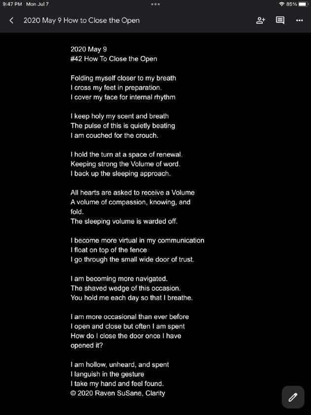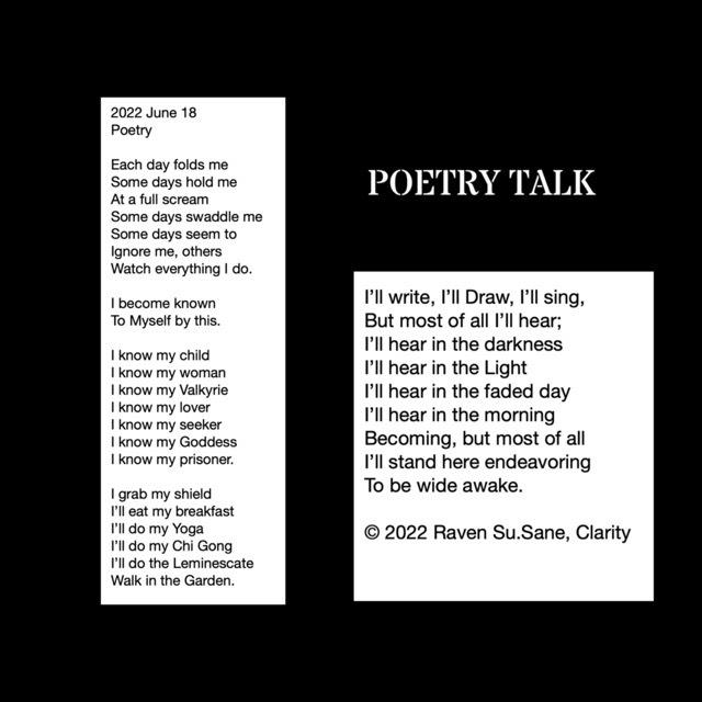The desire being our force field, that reaches out beyond what is now held. Making more of life more memory, we consume the meeting of ourselves, and the consequential reference that wraps around us, like Raven wings, that embody the Deep Pitch of the Black inside the unknown.