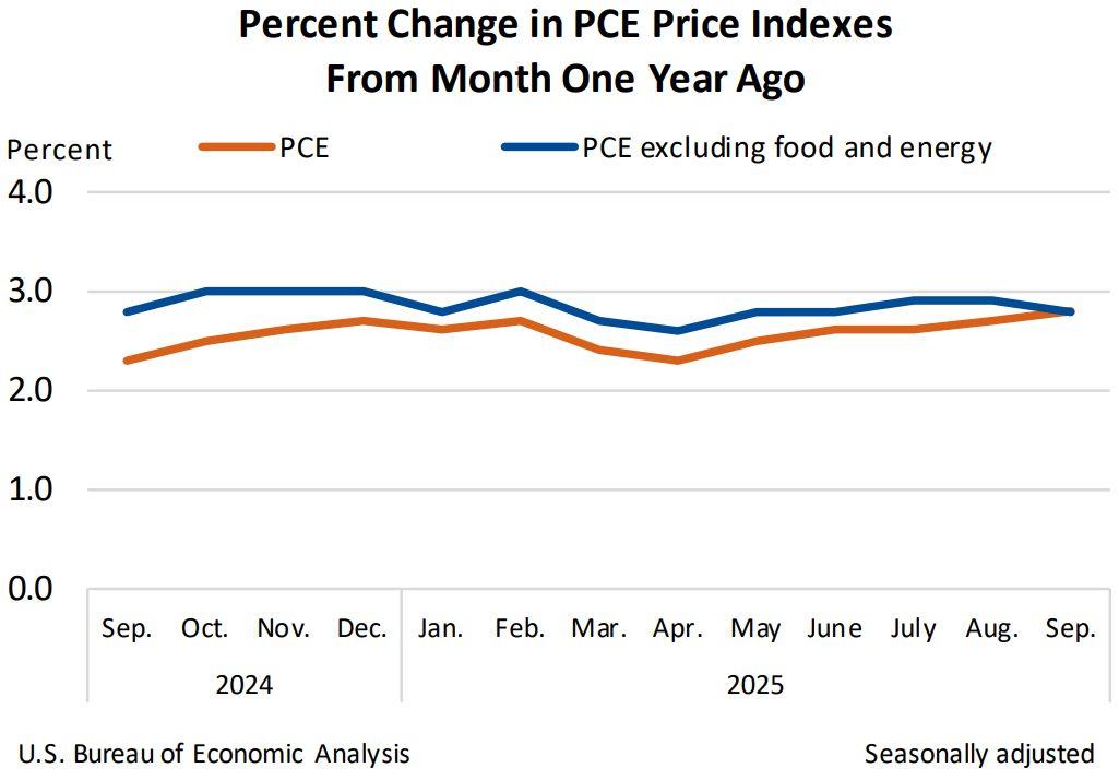 Tiêu dùng Cá nhân PCE), thước đo lạm phát ưa thích của Cục Dự trữ Liên bang FED,đãtăng0.3%trongtháng9.CảPCEtổngthểvàcốtlõiđềutăng2.8%sovới cùngkỳnămtrước,vớilạmphátcốtlõităng0.2%sovớithángtrước,phùhợpvới dựbáo.
