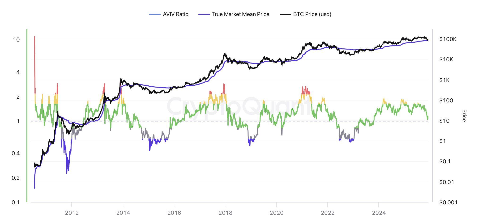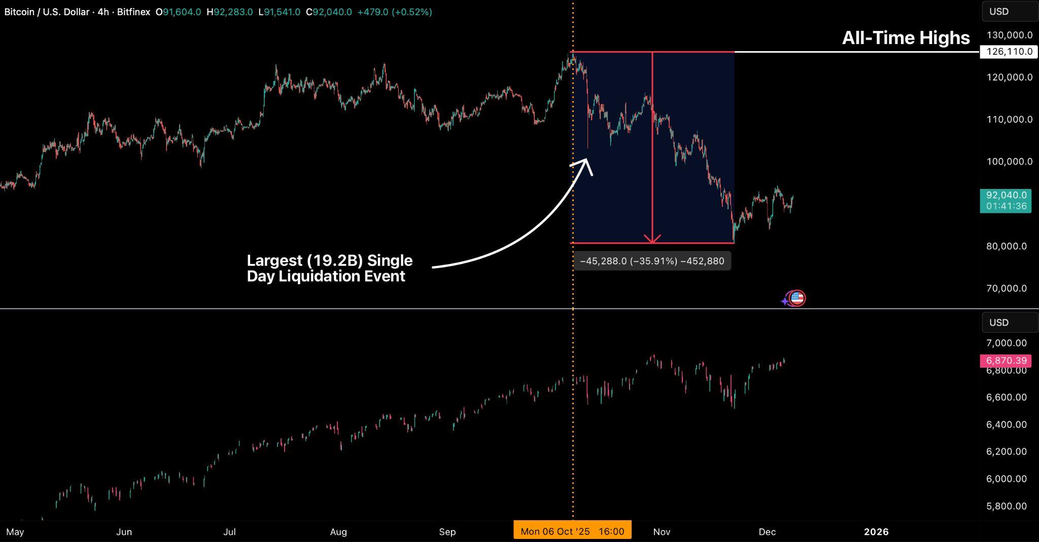 Kết hợp lại, những động lực này nhấn mạnh tầm quan trọng của cái mà chúng tôi gọi là Giá Trị Trung Bình Thực TMM (mức giá vốn của tất cả Bitcoin đang lưu hành, không tính thợ đào), vốn là ranh giới phân chia giữa một pha giảm giá giữa chu kỳ được kiểm soát và sự khởi đầu của một chế độ thị trường gấu rõ rệt hơn (xemHình3phíadưới).Việcbịtừchốikéodàidướingưỡngnàysẽlàmtăngnguy cơsuythoáicấutrúcsâuhơn,trongkhigiànhlạinóvẫnlàđiềukiệntiênquyếtđể thiếtlậplạiđộnglựcthịtrường.MứcgiáTrungBìnhThựchiệntạilà$81.470.