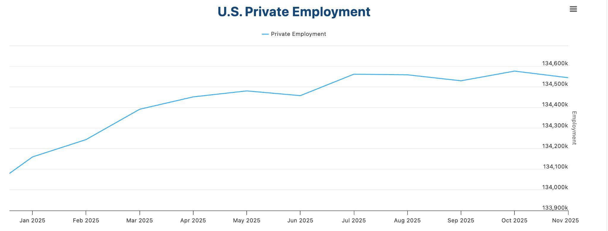 BáocáoViệclàmQuốcgiaADP,mộtkhảosátkhuvựctưnhândoADPcôngbố, chothấycácdoanhnghiệpMỹđãcắtgiảm32.000việclàmtrongtháng11.Đây là lần sụt giảm hàng tháng đầu tiên kể từ kỷ nguyên đại dịch và là một sự đảo ngược mạnh so với 47.000 việc làm được thêm vào trong tháng 10. Các doanh nghiệp nhỏ bị ảnh hưởng nặng nề nhất, sa thải 61.000 vị trí, một dấu hiệu cho thấy các công ty nhỏ hơn – vốn thường nhạy cảm nhất với lãi suất và nhu cầu chậm lại – đang cảm nhận rõ rệt áp lực từ "người tiêu dùng thận trọng và môi trườngvĩmôbấtổn,"theolờicủaNhàkinhtếtrưởngADPNelaRichardson.
