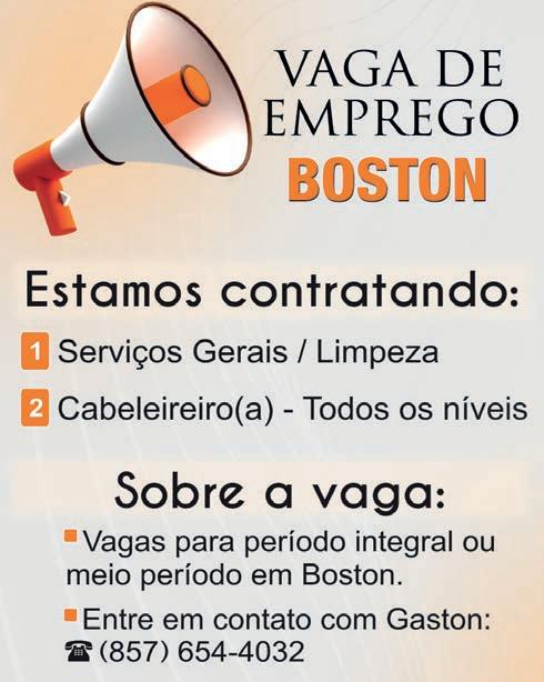 Vaga de emprego- Boston- estamos contratando. Serviços gerais, limpeza, cabeleiro (a), todos os níveis. Sobre a vaga: para período em Boston. Entre em contato com Gaston. (857) 654-4032. #D