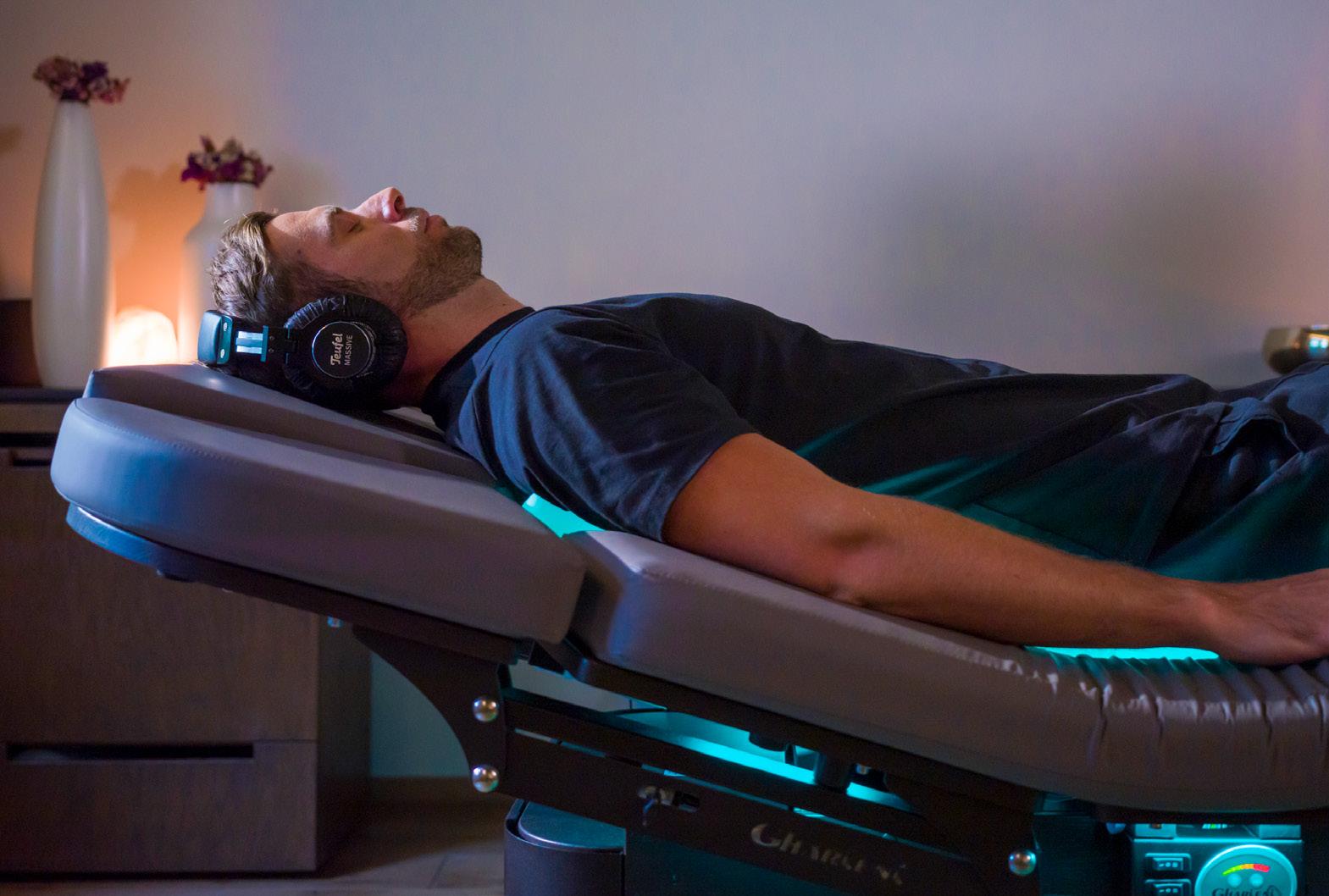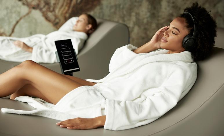 The zero-gravity Mind-Sync uses clinically tested vibroacoustic resonance therapy to reduce stress, ease anxiety and improve sleep quality. Offering six immersive programmes, the lounger gently moves quantum harmonic sound waves through the body using four powerful, full-spectrum transducers. Noise-cancelling headphones deliver two channels of proprietary entrainment frequencies, masked by gentle music and soothing nature sounds, to relax guests and place them in a state of parasympathetic control.