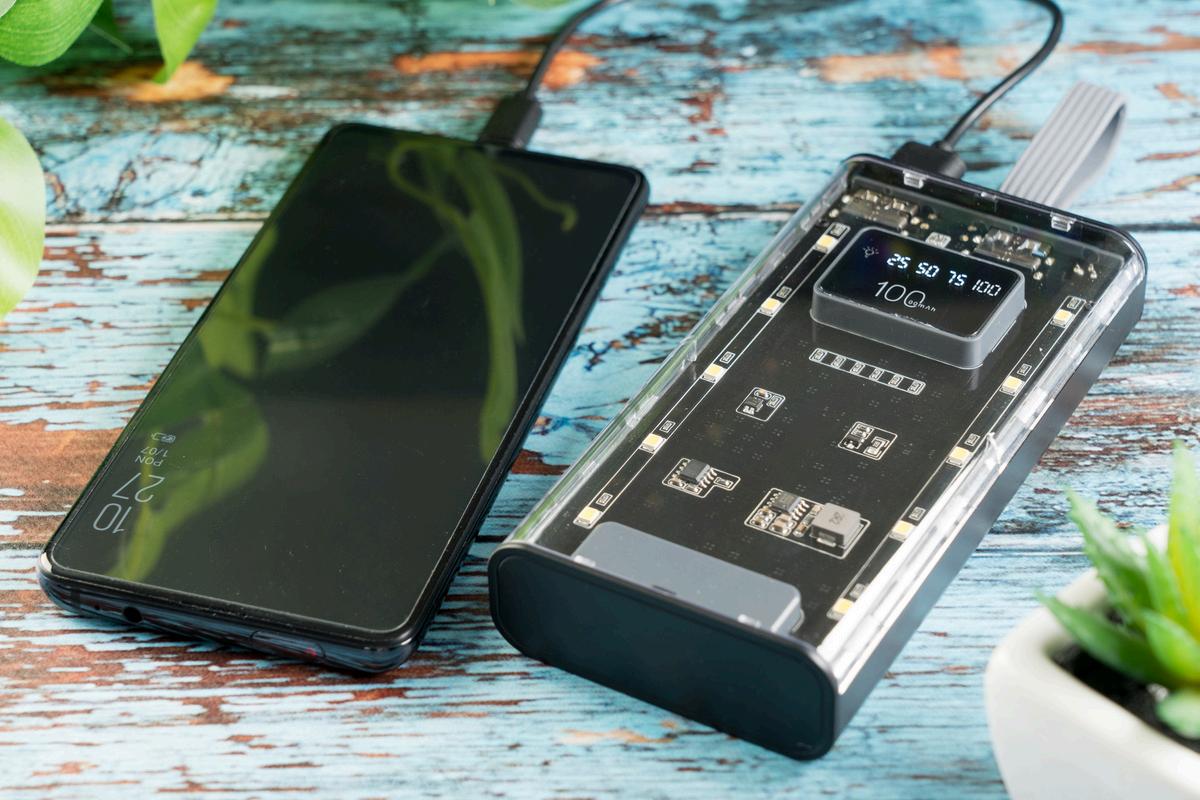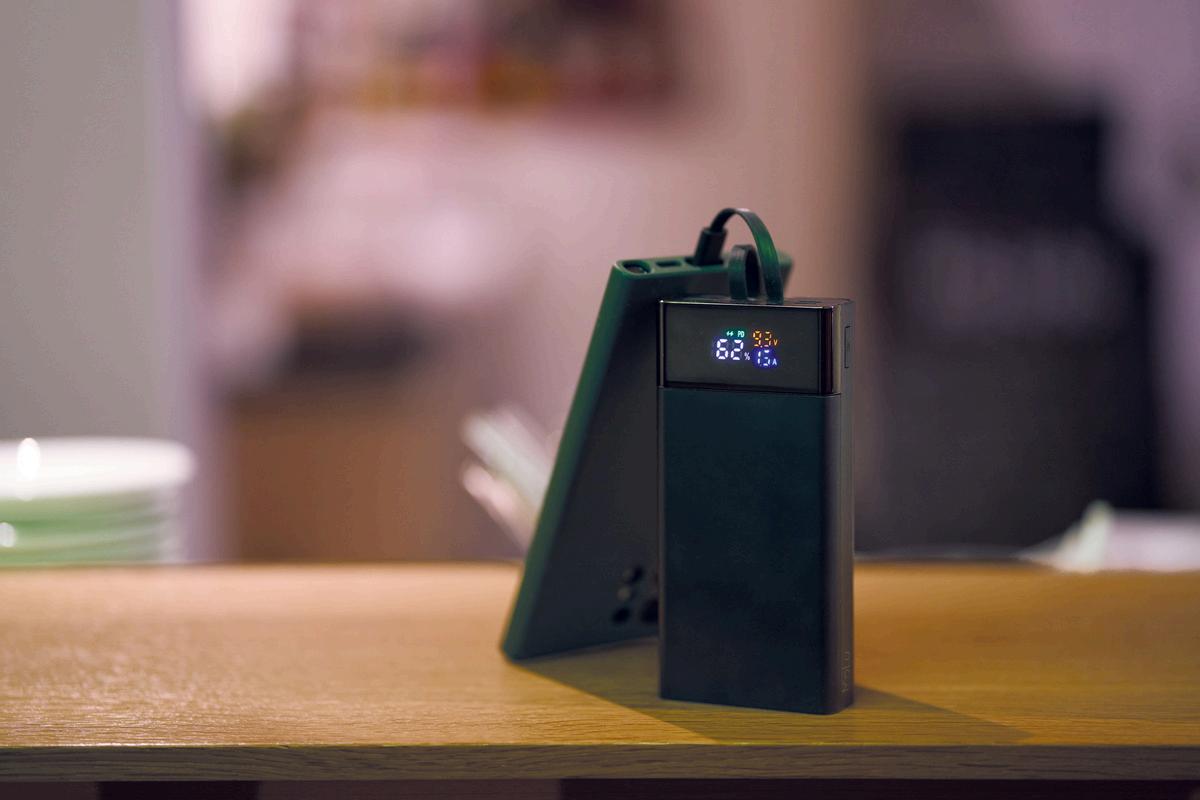 Posiada 2xport USB i port typu C, wbudowany kabel typu C i lightning oraz cyfrowy wyświetlacz
