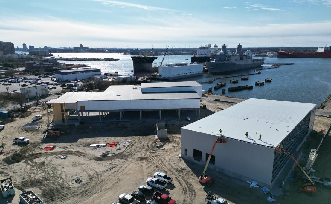 Balicore Construction is making significant progress at Fairwinds Landing constructing the Dominion control center for offshore wind. The LEED Silver MCC Building’s structure is now complete, with interior framing and rough ins currently in progress. Additionally, the building is temporarily driedin, ensuring protection during the construction process. The warehouse building’s structure is also finished, with the exterior wall and roof insulated metal panels completed. The new Pier project is in the final design stages.