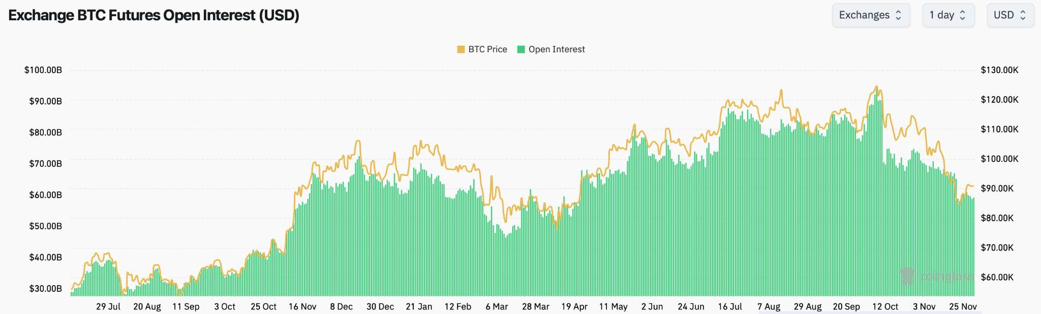 轉向鏈下市場動態,比特幣期貨與永續合約的未平倉量(OI)亦隨幣價同步下滑,穩步釋 放了先前上漲階段所累積的槓桿。