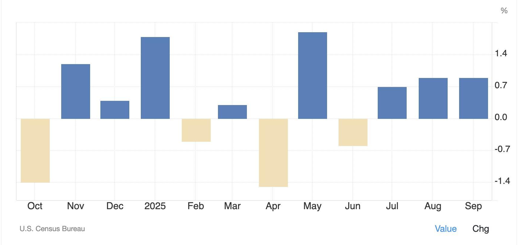 9 月數據優於市場預期的 0.2% 增幅。儘管受美國聯邦政府停擺影響導致數據延遲發布 ,但最新數據顯示,企業投資動能在整個季度持續增強。