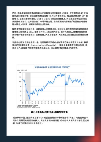 隨著零售動能放緩、生產者物價轉強,加上消費者日益謹慎,10 月份通膨數據的缺失, 讓聯準會在這一關鍵時刻面臨「能見度降低」的決策困境。在通膨不再趨緩且缺乏新數 據佐證的情況下,聯準會進入 12 月會議時將難以達成明確共識。然而,然而,有一點 已相當明確:市場需求正變得更加不均,未來的路徑將取決於通膨與家庭信心在未來 幾個月內能否迅 回穩。