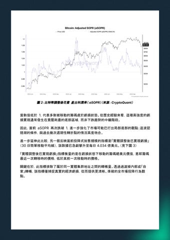 「調整後花費產出利潤率」(aSOPR)能夠提供更清晰的真實投資人行為樣貌。該指標衡量 籌碼被移動時的盈虧狀況,但排除了持有時間少於一小時的籌碼,以過濾掉套利資金流 或內部籌碼整理等短線雜訊。(見下圖 2)