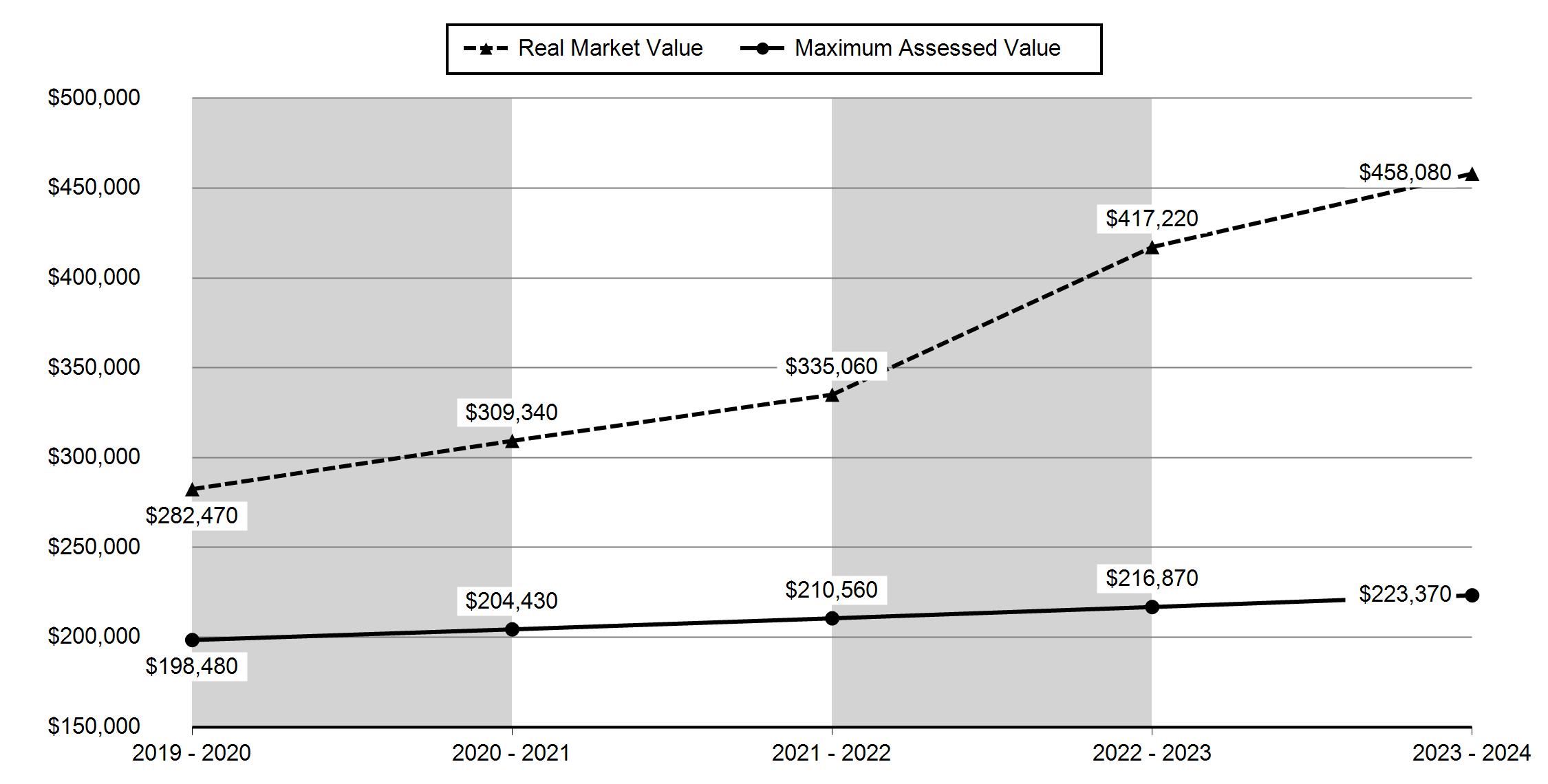 2019 - 2020 2020 - 2021 2021 - 2022 2022 - 2023 2023 - 2024 Real Market Value - Land $81,000 $91,000 $111,000 $187,500 $164,500 Real Market Value - Structures $201,470 $218,340 $224,060 $229,720 $293,580 Total Real Market Value $282,470 $309,340 $335,060 $417,220 $458,080 Maximum Assessed Value $198,480 $204,430 $210,560 $216,870 $223,370 Total Assessed Value $198,480 $204,430 $210,560 $216,870 $223,370 Veterans Exemption $0 $0 $0 $0 $0