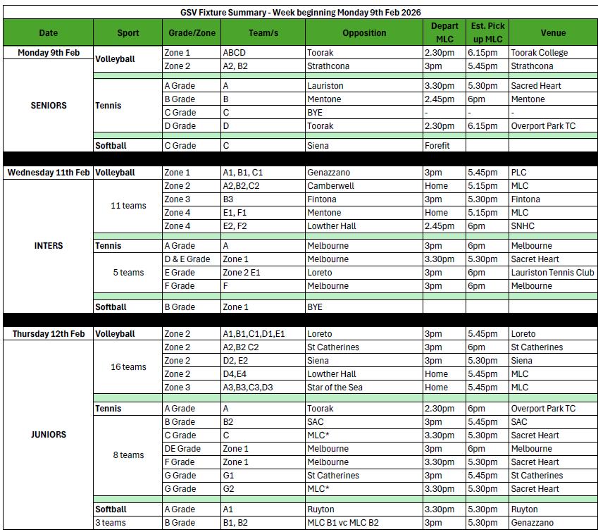 Bus Travel - If you are travelling by bus to an away venue, you will be signed out of class early to meet your coaches in the Chapel carpark. You must meet promptly so the bus can leave on time. If you are late, we cannot wait past 3pm as we are required to arrive on time for away matches Please communicate with your coach via teams message if you cannot play (with a valid reason) so they are not waiting around for you. If you are playing HOME at MLC you will not need to leave class early.