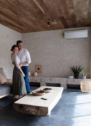 Die geschwungenen Blenden des Innengeräts spielen mit Schatten, die Daikin Emura förmlich zum Leben erwecken, während das Außengerät den rotierenden Ventilator geschickt verbirgt.
