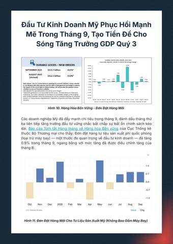 CácdoanhnghiệpMỹđãđẩymạnhchitiêutrongtháng9,đánhdấuthángthứ ba liên tiếp tăng trưởng đầu tư vững chắc bất chấp sự bất ổn chính sách kéo dài. Báo cáo Tóm tắt Hàng tháng về Hàng hóa Bền vững của Cục Thống kê thuộcBộThươngmạichothấy:Đơnđặthàngtưliệusảnxuấtphiquốcphòng (loạitrừmáybay)—mộtthướcđoquantrọngvềđầutưkinhdoanh—đãtăng 0.9% trong tháng 9, ngang bằng với mức tăng đã được điều chỉnh tăng của tháng8.