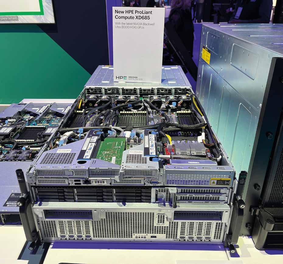 Der HPE Proliant Compute XD685 in der Nvidia-Variante bringt dank Flüssigkeitskühlung acht Nvidia-B300-GPUs in einem 5U-Gehäuse unter. Die luftgekühlte Variante rechts daneben belegt dagegen 10 Höheneinheiten im Rack.