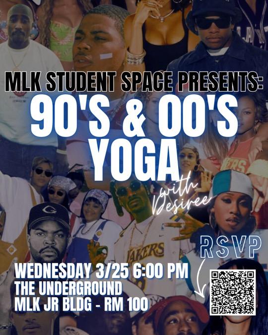 •90’s & 00’s Yoga Event: This flyer highlights one of our monthly yoga nights that we host in the space. These sessions are designed to help students prioritize their mental health in a way that feels accessible and engaging. By incorporating a fun theme like 90’s & 00’s music, it helps lower barriers to participation and creates a welcoming atmosphere while still centering mindfulness and wellness .
