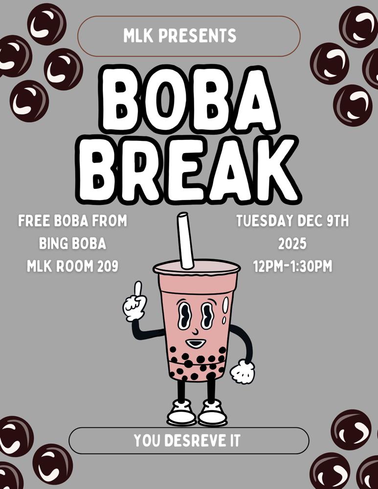 •“Boba Break” – Winter Wrap Up Week : I created Winter Wrap Up Week as a way to give students a space to unwind and reconnect with the community before finals Knowing how overwhelming this time can be, I wanted to offer simple, low -pressure opportunities for students to take a break “Boba Break” was one of those moments, students could come in, grab a drink, and just breathe for a bit without thinking about assignments or exams . It created a relaxed environment where students could reset mentally and socially.