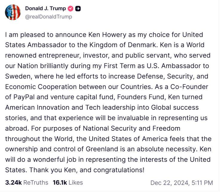 TheissuefirstresurfacedinDecember2024,whenPresident-electDonaldTrump, in a Truth Social post, described US “ownership and controlˮ of Greenland as essential for national security, citing growing Russian and Chinese activity in the Arctic.TheremarksechoedTrumpʼs2019characterisationofGreenlandasa“large realestatedealˮ.