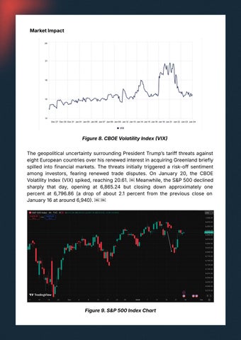 ThegeopoliticaluncertaintysurroundingPresidentTrumpʼstariffthreatsagainst eightEuropeancountriesoverhisrenewedinterestinacquiringGreenlandbriefly spilled into financial markets. The threats initially triggered a risk-off sentiment among investors, fearing renewed trade disputes. On January 20, the CBOE VolatilityIndexVIX)spiked,reaching20.61.  Meanwhile,theS&P500declined sharply that day, opening at 6,865.24 but closing down approximately one percent at 6,796.86 (a drop of about 2.1 percent from the previous close on January16ataround6,940.