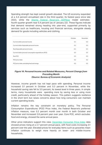 However, income growth has not kept pace with spending. Personal income increased 0.1 percent in October and 0.3 percent in November, while the householdsavingratefellto3.5percent,itslowestlevelinthreeyears.Insimple terms, many households were spending more by saving less or using more credit, particularly ahead of the holiday season. This pattern suggests resilience in the short term but raises concerns about how long consumers can maintain currentspendinglevels.