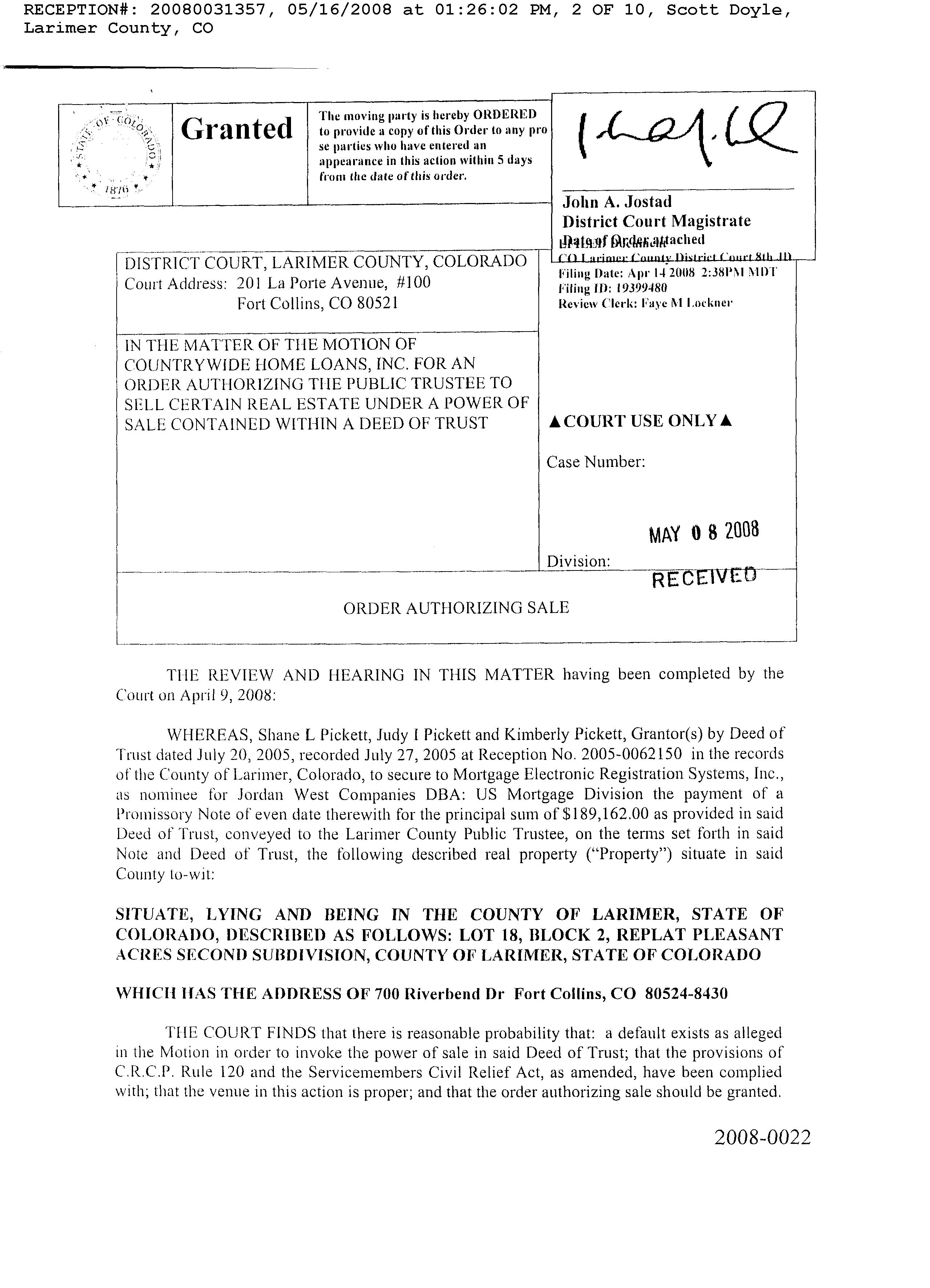 Recording/Sale Date : 05/27/2010 / 05/20/2010