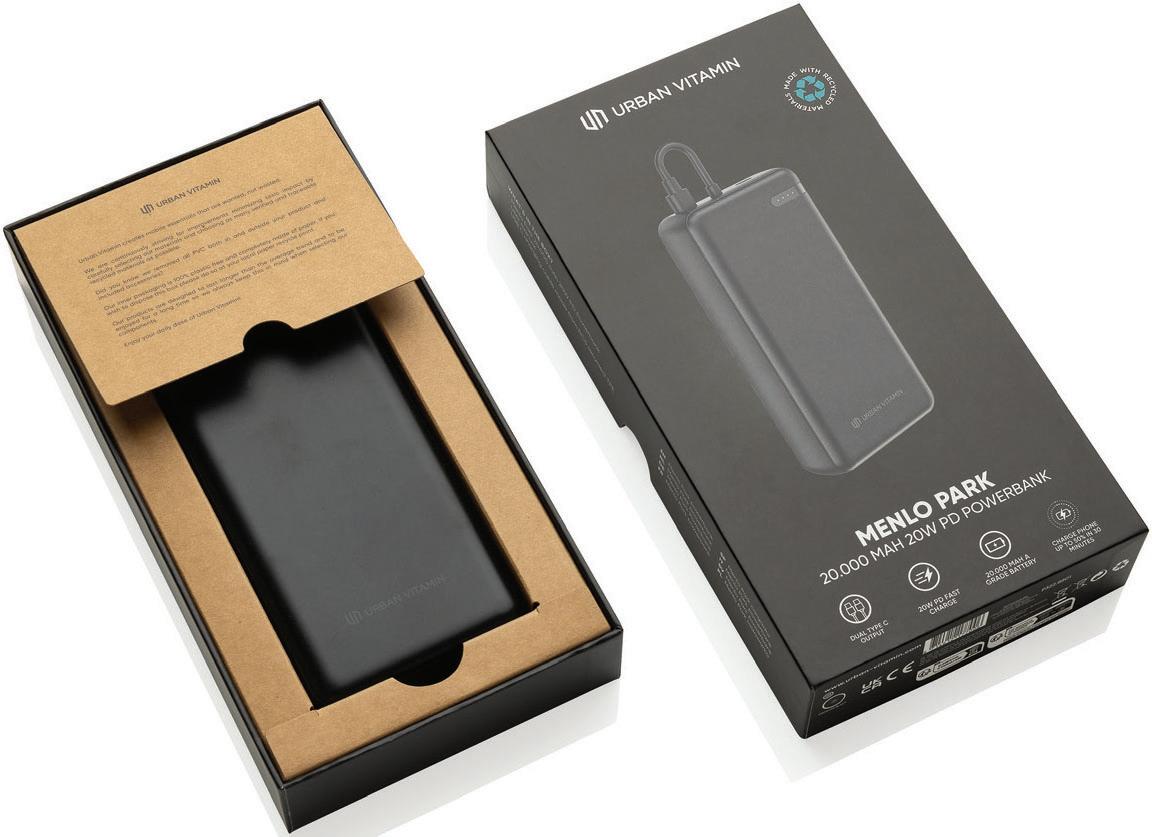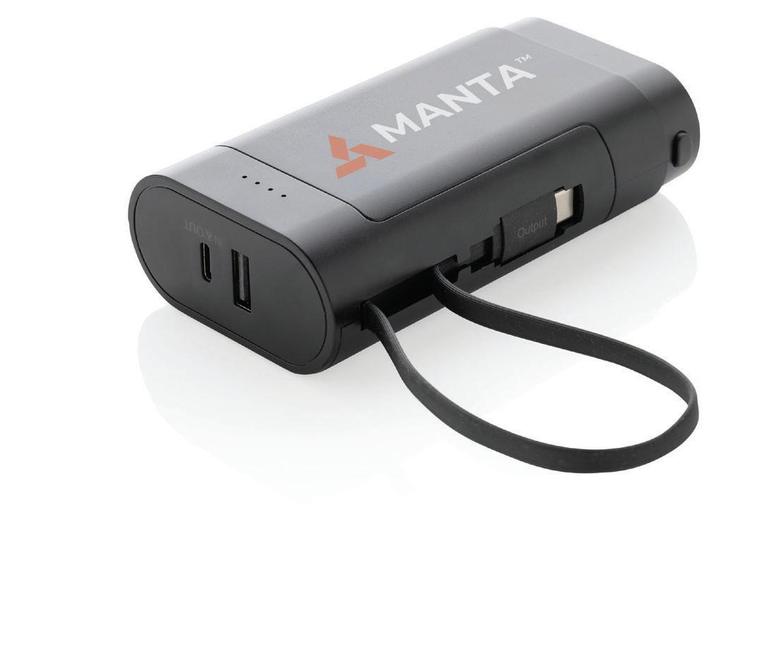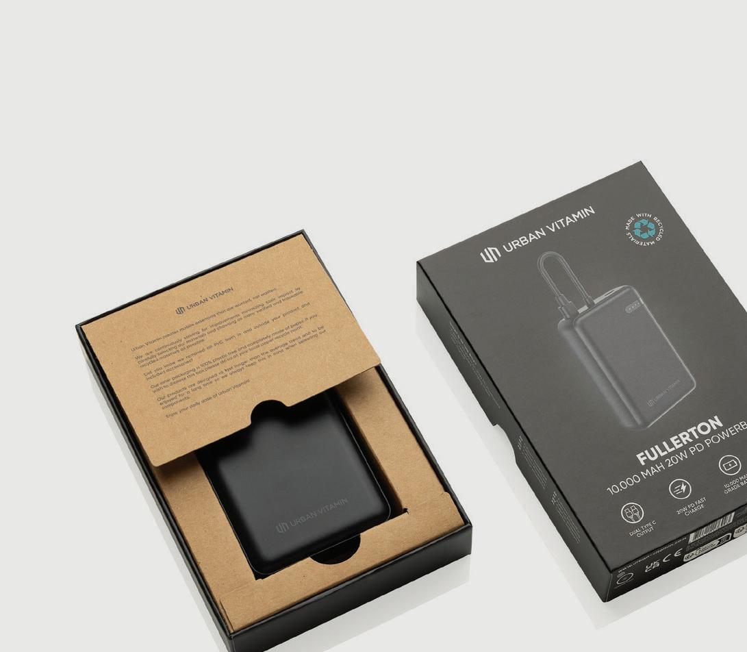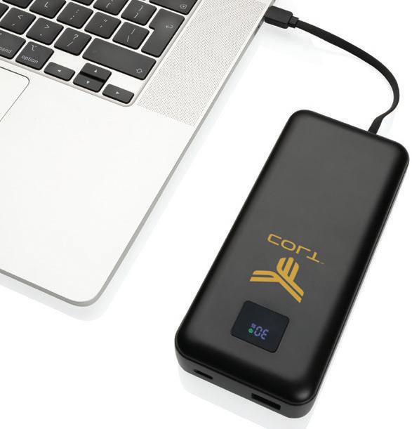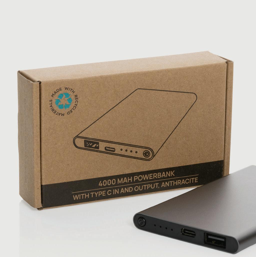 Recycled Polycarbonate • 12W • Charges your phone up to 2 times • USB output(s) • USB C port • Type-C charging connector(s) • Charging indicator • Approved as carry-on luggage • Can charge other devices while it charges itself • Loads 3 device(s) simultaneously Size