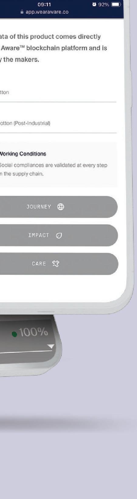 IQONIQ uses the Aware™ solution, which combines a physical tracer with public blockchain technology, ensuring the authenticity of its claims and offering trusted traceability. Every product can be traced, thanks to a physical tracer that tracks its journey from the raw