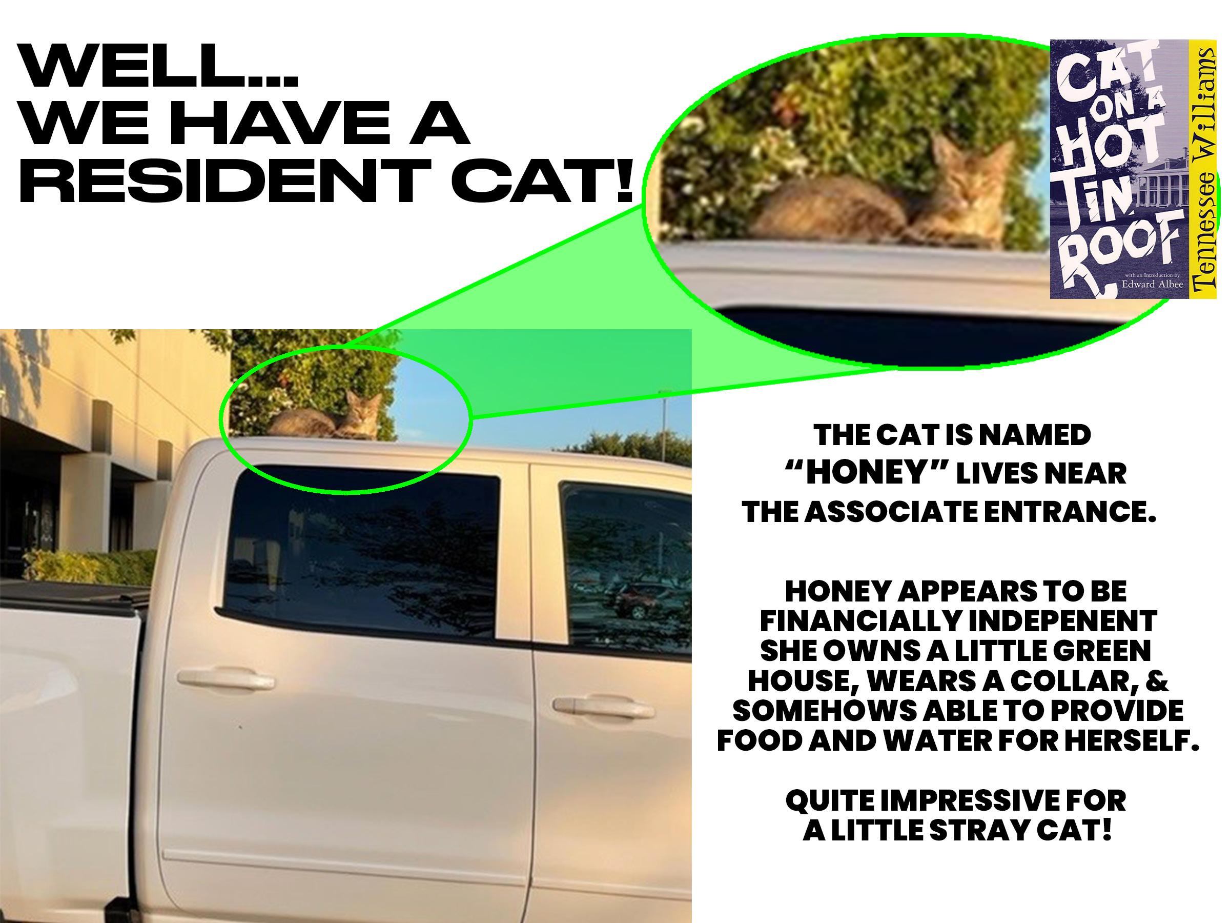 DENMARK MEXICO BRAZIL CHINA INDIA CANADA AFGHANISTAN ARGENTINA ENGLAND TURKEY CAMBODIA ICELAND FRANCE KENYA CHILE NETHERLANDS NORWAY NIGERIA SWEDEN JAPAN THE CAT NAMED “HONEY” LIVES NEAR THE ASSOCIATE ENTRANCE. HONEY APPEARS TO BE FINANCIALLY INDEPENDENT. SHE OWNS A LITTLE GREEN HOUSE, WEARS A COLLAR, & SOMEHOW IS ABLE TO PROVIDE FOOD & WATER FOR HERSELF. QUITE IMPRESSIVE FOR A LITTLE STRAY CAT!