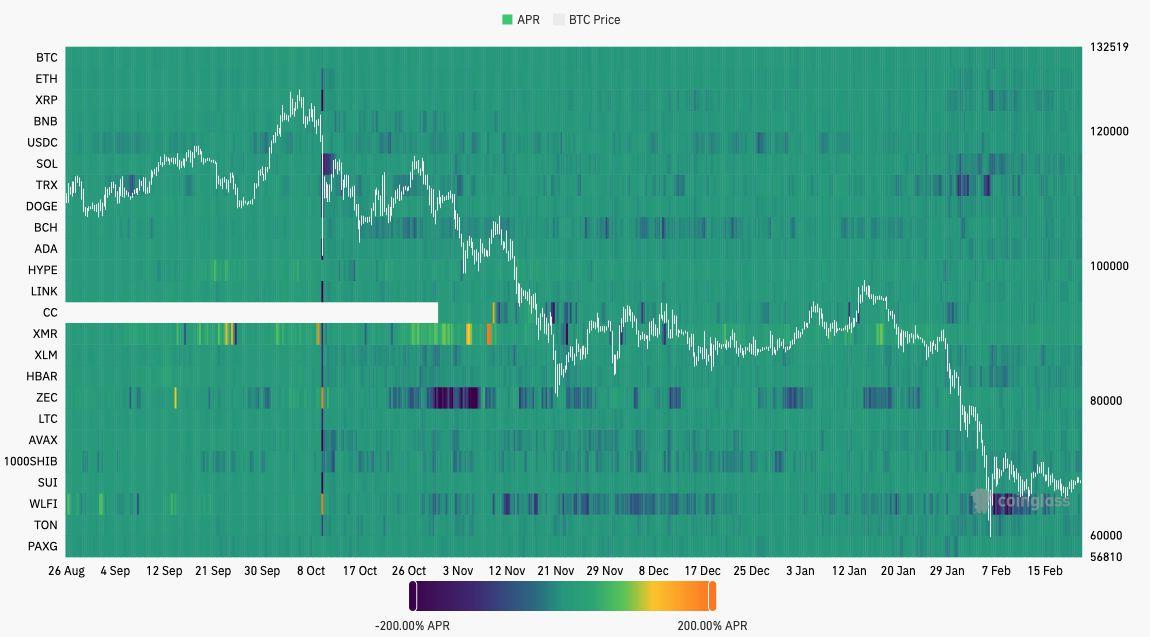 Thịtrườngpháisinhcũngđangbịghìmhãm,vừatạosựổnđịnh,vừahạnchếđà bứt phá. Funding rate của các hợp đồng vĩnh cửu đã nén mạnh trên hầu hết các sàn, với Bản Đồ Nhiệt Funding Rate Xem Hình 7 bên dưới) phản ánh rõ sự thay đổi:từfundingdươngkéodàitronggiaiđoạngiátiếnsát$120,000,sangtrạngthái trung tính và đôi lúc âm khi Bitcoin lùi về vùng $70,000. Điều này cho thấy đòn bẩyvịthếmuađãbịxảbỏmộtcáchquyếtliệt.