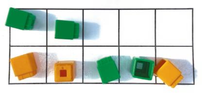 Su estudiante practica cómo hallar parejas de números que suman 6 por medio de un nuevo juego llamado Agita esos discos. El juego consiste en agitar un vaso con 6 fichas para contar de dos colores que luego se vuelcan sobre un escritorio. Se colocan en línea todas las fichas para contar amarillas y rojas y, luego, se registran las partes y el total en un vínculo numérico. Continúan agitando y volcando las fichas para contar hasta que todos los vínculos numéricos de la página de registro estén completados.