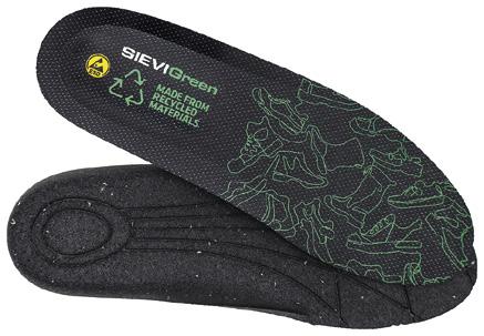 Recycled materials account for 67% of the total weight of the materials used in the insole. The surface material is polyamide, which is incredibly wear resistant and wicks moisture from the feet to the lower layer of the insole. The insole is antibacterial and odourless. The heel design keeps the foot’s fat pad in an optimal position, and the insole conforms to the shape of the foot and rebounds to its original shape when the footwear is taken o!. Antistatic and machine washable at 40°C.
