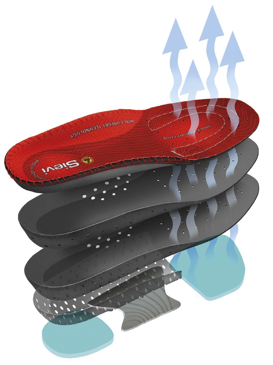Sievi’s Metashield® metatarsal guard is integrated into the shoe’s structure and absorbs impacts on the instep by up to 90 percent. The guard, made of PORON XRD® material, is very flexible and its molecular structure, together with the shoe’s breathable upper material, allows air to circulate and remove moisture from the shoe, making it very pleasant to wear. The Metashield® metatarsal guard o!ers significantly better protection than conventional safety shoes, without compromising comfort.