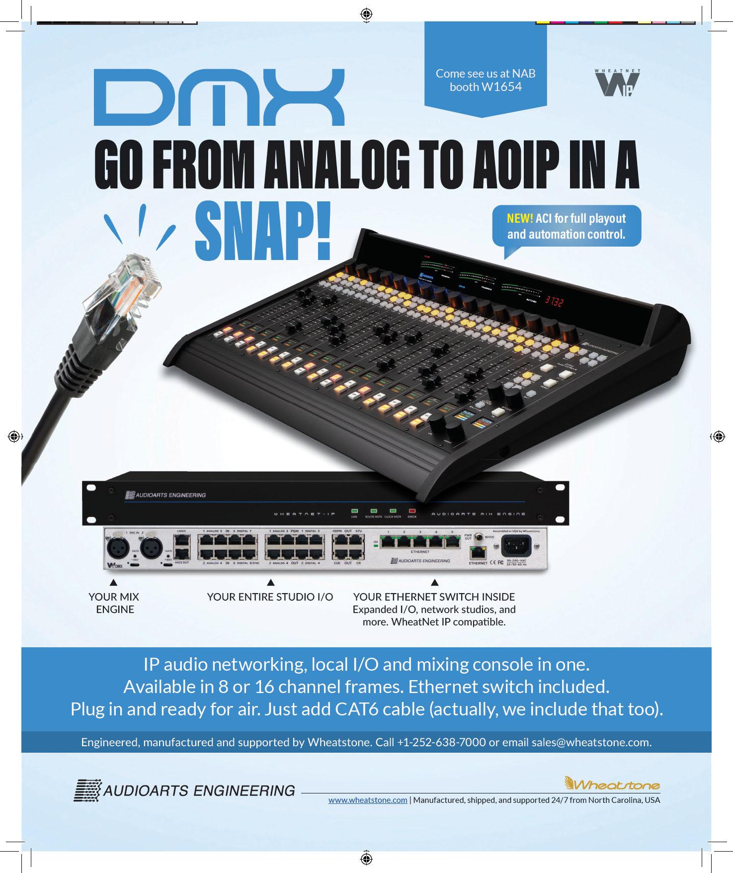 Now WheatNet IP compatible: Audioarts DMX console system including mix engine with local I/O, five-port Ethernet switch and automation plugin for a fully self-contained AoIP system in one. Ideal for smaller facilities or for budget studios that serve as backup to a main.